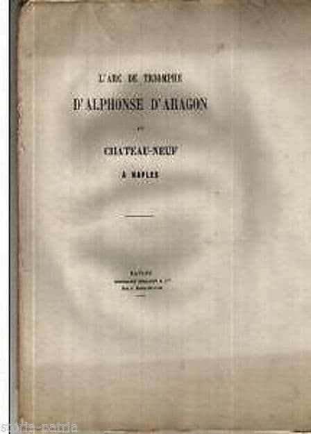 L'Arc de Triomphe **d'Alphonse d'Aragon** **au Chateau-Neuf** **a Naples** Naples, Ferrante, s.d. (ca.1850). Cm.29,5; pp.27; senza legatura. Interessante edizione originale antica e d'epoca, pubblicazione in lingua francese, relativa alla descrizione del noto monumento storico-artistico aragonese in Napoli, con all'interno riferimenti o citazioni relative a Cicognara, Mori, Manfredi, Giovanna II, Maiorca, Corsica, Sicilia, Sardegna, Nicola Maria Bozzuto, Chiesa di S. Lorenzo, Giovanni Pisano, l'Arcangelo S. Michele, S. Antonio, S. Sebastiano, Giulio da Maiano, Pietro Di Martino, Vasari,...; *opera di cui sarebbe interessante ricercarne l'anonimo autore.* Di interesse culturale, storico-artistico, storico-locale, bibliografico ***rarissima edizione originale, un solo esemplare noto nel sistema bibliotecario nazionale.*** Discreta conservazione generale, segni e difetti d'uso e d'epoca, sparse fioriture e difetti vari marginali, **non presenti illustrazioni** (citate nell'esemplare repertoriato), senza legatura o copertine con dorso rotto e parzialmente a fogli sciolti anche se parzialmente ancora a fogli chiusi, pertanto esemplare meritevole di rilegatura.