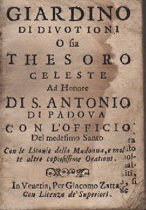 Giardino di Divotioni O Sia Thesoro Celeste Ad Honore di S. Antonio di Padova *Con l'Officio del Medesimo Santo* *Con le Litanie della Madonna, e Molte Altre Copiosissime Orationi* Venetia, Giacomo Zatta, s.d.(fine '700 ?) Cm.9,5; pp. 144; legatura antica in pelle (sciupata) Interessante antica edizione a cura del noto stampatore veneziano Zatta, pubblicazione devozionale e ad uso tascabile, grazioso minilibro dedicato al celebre Santo venerato in Padova, con contenuto ben sintetizzato nel titolo stesso al frontespizio, ossia devozioni e litanie o preghiere varie. Di interesse devozionale collezionistico bibliografico *rarità, **nessun esemplare noto** nel sistema bibliotecario nazionale italiano* Modesta conservazione generale, segni e difetti d'uso e d'epoca, fioriture e vaste gore, erosione o strappo marginale al frontespizio con probabile perdita della data di edizione (ma come era frequente in molte edizioni simili, la data poteva anche non essere stampata); erosioni e difetti o strappetti o erosioni o annotazioni e piegature e sgualciture ad alcune pagine; esemplare a margini molto corti e mal rifilati irregolarmente; opera scompleta di alcune pagine iniziali, in particolare **mancano** le pagine fino alla ottava compresa, ossia al frontespizio segue la pagina 9; e **mancano** pure le pagine da 49 a 58 (incluse) ; legatura allentata e staccata e pertanto da risistemare; l'antica legatura in pelle scura ha mancanze marginali e al dorso per usura dovuta all'epoca e alla sua conservazione o utilizzo (è comunque un oggetto che ha oltre due secoli!!), ma è legatura gustosa per essere stata realizzata fissando la pelle su supporto non cartaceo ma ligneo ossia su belle sottili tavolette in legno; si notano ancora gli originali tagli dorati alle pagine; **complessivamente opera scompleta** e con difetti vari non facilmente quantificabili, ma esemplare utile come cimelio bibliografico e comunque da collezione per bibliofili o collezionisti di antiche edizioni veneziane o della gloriosa tipografia Zatta o collezionisti di mini libri; esemplare meritevole di eventuale restauro, ma anche così molto fascinoso nel suo evidente secolare vissuto. *(per lo stato di conservazione e per i difetti evidenziati l'opera è offerta così com'è senza lacuna garanzia di integrità o di conservazione; a richiesta eventuali ulteriori informazioni)*