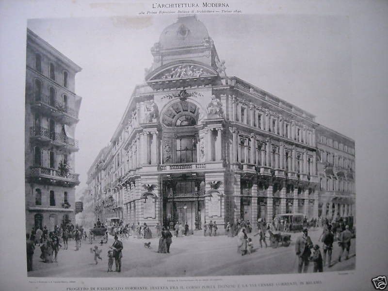 L'architettura moderna Alla prima esposizione italiana di architettura Torino 1890 Progetto di fabbricato *formante testata fra il Corso Porta Ticinese e la Via Cesare Correnti* *Milano* *Antica e rara raffigurazione architettonica,* *con la bella veduta prospettica del maestoso palazzo, che con la sua imponenza è al centro delle due note strade milanesi, strade eccezionalmente animate dalla presenza di molteplici viandanti, uomini donne bambini animali carrozze carretti strilloni..., il tutto molto pittoresco e testimonianza visiva di un momento di vita di città di fine secolo '800;* *progetto dell'architetto Antonio Tagliaferri, esposto alla nota rassegna specialistica di Torino.* Belle dimensioni, misura circa cm. 35x49 (dimensioni dell'intero foglio, compresi i margini bianchi); stampa antica e d'epoca, eseguita in fototipia da A. Charvet-Grassi ("da un disegno all'acquarello"), e impressa dagli editori torinesi Camilla e Bertolero /A. Charvet-Grassi, alla fine dell'800. Di interesse artistico storico-locale architettonico specialistico decorativo Buona conservazione generale, segni e difetti d'uso e d'epoca, sparse fioriture, sgualciture strappetti e difetti marginali; **meritevole di essere inserita sotto passpartout ed incorniciata.** *(le immagini allegate raffigurano un particolare dell'intero foglio)* *########* *Della stessa serie e di interesse lombardo sono pure disponibili i seguenti progetti, simili per dimensioni tecnica ed epoca:* *Casa Rigamonti, in via Solferino (Milano): arch. Locati* *Casa Bottelli, in via Dante (Milano): arch. Romeo Bottelli* *Casa Moretti, in via Dante (Milano): arch. Romeo Bottelli* *Casa Sartorelli, in via S. Raffaele (Milano): arch. Locati* *Nuove Scuole Elementari Comunali, in via Galvani (Milano): arch. Camillo Boito (4 tavole!)* *Edicola Funeraria per Carlo Pozzi, nel Cimitero di Milano: arch. Locati* *Casa da pigione (Milano): arch. Bottelli* *Ricovero-modello del Pio Istituto di Maternità dei bambini lattanti e slattati (Milano): arch. Emilio Biganmi-Sormani* *Salone del Palazzo Municipale di Brescia: arch. Tagliaferri* *Nuovo altare maggiore della Chiesa di S. Francesco in Vigevano: arch. Gaetano Moretti* *Cimitero di Pavia: arch. Angelo Savoldi (2 tavole!)* *Scuola di Agricoltura "Giuseppe Pastori" (Orzivecchi, Brescia): ing. Luigi Morelli (3 tavole!)* *...........* *(eventuali altre informazioni a richiesta, ovviamente l'offerta presente in asta riguarda solo la stampa su descritta)*