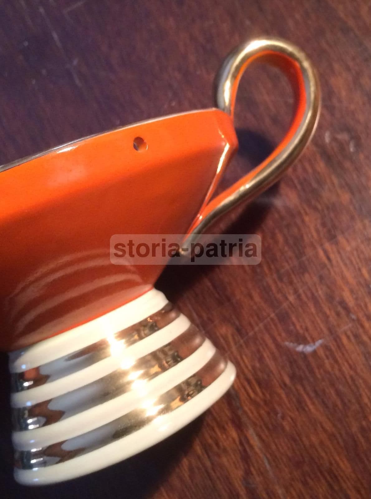 (Porcellane Liberty) Interessante insieme di antiche porcellane, elementi di un antico servizio da caffè, utili per completazione, ma interessanti anche per collezionisti di singoli oggetti; disponibili complessivamente cinque pezzi, di cui due tazzine e una caffettiera e una zuccheriera e una lattiera, *tutti impreziositi da bel modellato e piacevole policromia con anche dorature, oltre che da suggestive miniature raffiguranti scene classicheggianti;* in porcellana, con marchio di fabbrica impresso sotto la base, di produzione austriaca (Vienna); oggetti databili in epoca liberty, ossia la primo '900. Di interesse artistico, decorativo, collezionistico Discreta conservazione generale, segni e difetti d'uso e d'epoca, usuali sparse abrasioni e segni di usura e ossidazioni e difetti vari marginali o così come visibili nelle immagini allegate; insieme meritevole di pulitura o lucidatura o piccoli restauri; dispersi i coperchi della zuccheriera e della caffettiera, le due tazzine sono prive di piattini, il tutto così come visibile nelle immagini allegate, così come rinvenuto in una vecchia raccolta di famiglia. *(le immagini allegate raffigurano alcuni particolari dell'intero insieme, eventuali ulteriori informazioni a richiesta)* *\>oggetto in conto vendita, e pertanto conservato in collezione privata<*