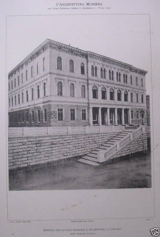 L'architettura moderna Alla prima esposizione italiana di architettura Torino 1890 Edificio per scuole primarie e secondarie *Carrara* *Antica e rara raffigurazione architettonica,* *con la bella veduta prospettica del maestoso palazzo ad uso scolastico, con anche una rampa di accesso;* *su tavola distinta è apprezzabile di questo progetto la sezione longitudinale, la pianta del pianterreno, e la pianta del secondo piano;* *progetto dell'architetto Leandro Caselli, esposto alla nota rassegna specialistica di Torino.* Belle dimensioni, misura ogni foglio circa cm. 35x49 (dimensioni dell'intero foglio, compresi i margini bianchi); stampe antiche e d'epoca, eseguite in fototipia da M. Bassani ("dal vero"), e impresse dagli editori torinesi Camilla e Bertolero, alla fine dell'800. Di interesse artistico storico-locale architettonico specialistico decorativo Buona conservazione generale, segni e difetti d'uso e d'epoca, sparse fioriture, sgualciture o difetti marginali; **meritevoli di essere inserite sotto passpartout ed incorniciate.** *(le immagini allegate raffigurano un particolare di uno dei due fogli)* *########* *Della stessa serie sono pure disponibili i seguenti progetti, simili per dimensioni tecnica ed epoca:* *Caserma Dogali (Carrara): progetto arch. Leandro Caselli: due tavole distinte.* *(eventuali altre informazioni a richiesta)*