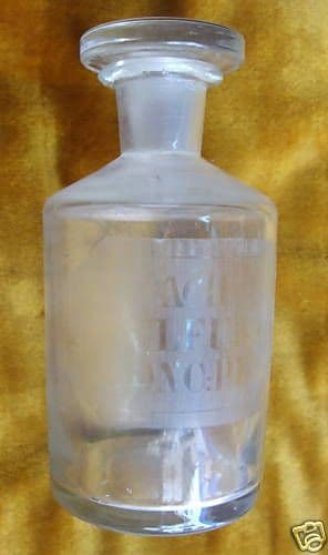 Acid Sulfuric: Conc: Pur: Bella e antica bottiglia in vetro, ancora provvista anche del suo tappo pure in vetro, in origine barattolo contenitore di un composto chimico, forse ad uso farmaceutico e medicinale, probabilmente componente che veniva utilizzato dai farmacisti nelle loro preparazioni galeniche. *Le scritte sono incise frontalmente su un fondo molato (a simulazione di etichetta)* Misura cm. 14 (altezza, compreso il tappo), cm. 6 circa (diametro della base); databile alla fine dell'800. Da collezione Buona conservazione generale, usuali segni o difetti d'uso e d'epoca, barattolo ovviamente vuoto, così come dalle immagini allegate, così come rinvenuto in una vecchia soffitta di famiglia.