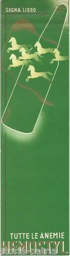 Hemostyl *Tutte le anemie* Interessante antico e raro vecchio segnalibro, pubblicitario del medicinale Hemostyl per la cura delle anemie (patologie del sangue); bellissima grafica, quasi di gusto futurista, con raffigurati alcuni cavalli bianchi in corsa sullo sfondo di una boccetta del medicinale; *in cartoncino leggero, litografato similmente su entrambi i lati, misura circa cm. 23,5x6,5; databile alla prima metà del '900 (circa anni '30 ?)* Di interesse pubblicitario, artistico, collezionistico Buona conservazione generale, segni e difetti d'uso e d'epoca, piegature e sgualciture ad una delle due estremità, usualmente quella che usciva fuori dal libro dove era inserito.