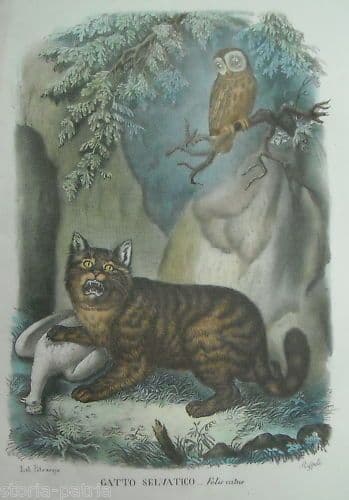 Gatto selvatico *Felix catus* Stampa originale antica e d'epoca, bella e realistica raffigurazione di un gatto selvatico, con espressione feroce, dopo aver aggredito una anatra o gallina o animale simile, mentre nella penombra della notte su un ramo di un albero è visibile un uccello notturno, forse un barbagianni o una civetta o altro similare, in tutto nel paesaggio circostante, tra vegetazione e rocce; *incisione originale litografica, eseguita dal litografo napoletano Petraroja, su disegno dell'artista Rispoli; bella coloritura d'epoca (spesso queste litografie venivano impresse in nero e poi acquarellate a mano, oppure impresse a colori dopo vari passaggi delle matrici in pietra litografica);* *misura circa cm. 38x27 (l'intero foglio, compresi i margini bianchi irregolari o diseguali), opera databile alla seconda metà dell'800.* Di interesse specialistico, scientifico, zoologico, collezionistico, decorativo Modesta conservazione generale, segni e difetti d'uso e d'epoca, sparse fioriture, bruniture e sgualciture e strappi e strappetti e mancanze e difetti vari marginali, difetti marginali facilmente mascherabili da un passpartout, comunque con raffigurazione ben conservata, così come da immagine allegata, **pertanto stampa meritevole di essere inserita sotto passpartout ed incorniciata.** *(l'immagine allegata raffigura un particolare dell'intero foglio, eventuali ulteriori informazioni a richiesta)*