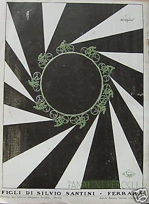 Figli di Silvio Santini Ferrara Fanalini per cicli **Interessante antica e rara stampa pubblicitaria della nota ditta ferrarese, bella grafica futurista dell'artista Sinopico, ad indicare la molteplice azione illuminante dei proiettori per biciclette venduti dalla ditta Santini.** **  ** **Di interesse collezionistico per le varie tematiche collegate** Misura cm. 24x18 circa (intero foglio), senza data (ma stampa litografica o serigrafica illustrativa di una copertina di una rivista del 1919, copertina originale con al verso la bella pubblicità figurata della collana editoriale Biblioteca dei Ragazzi, anch'essa disegnata dal Sinopico); buona conservazione generale, segni o difetti d'uso e d'epoca, scolorimenti per abrasione o per difetto editoriale e di stampa, difetti marginali; degna di essere inserita sotto passpartout ed incorniciata.