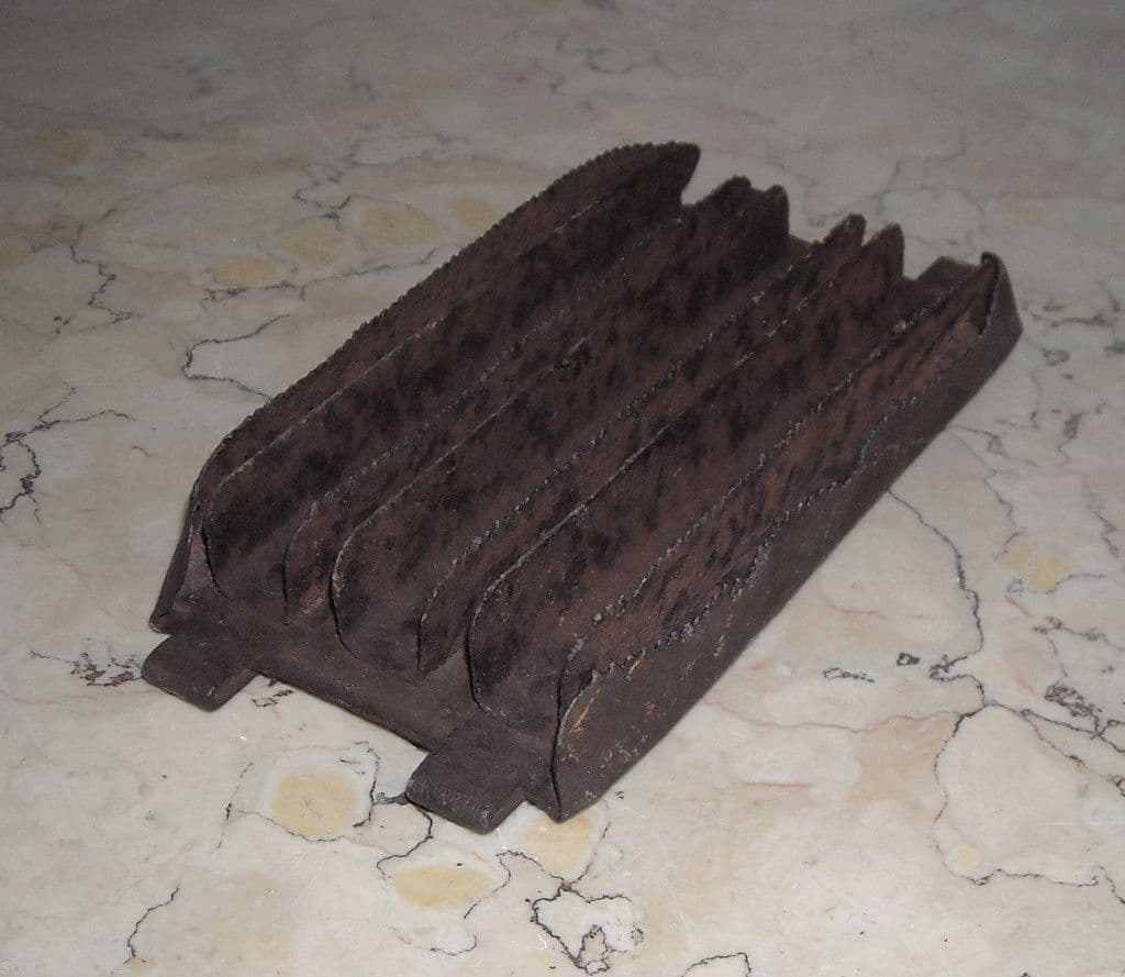 Inusuale antico strumento Strumento in ferro, probabilmente una antica spazzola, con la base in ferro su cui sono inchiodettate alcune lamine pure in ferro, parte delle quali dentate, *probabilmente strumento utilizzato nelle scuderie o nelle stalle per uso agricolo o zootecnico, per la pulitura e la pettinatura del pelo o del manto di cavalli o altro bestiame;* interamente in ferro battuto, con i vari elementi inchiodati fra loro (no saldature!); misura circa cm.18x8,5x2 (massime dimensioni esterne, comprese le sporgenze laterali); databile presumibilmente alla fine dell'800 (?) Di interesse folklorico, tecnico, collezionistico Modesta conservazione generale, segni e difetti d'uso e d'epoca, diffusa ossidazione del metallo (ruggine), ammaccature e difetti vari, eventualmente meritevole di pulitura e lucidatura o restauro, ma oggetto molto fascinoso nel suo evidente vissuto.