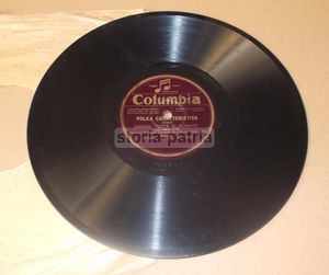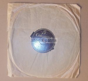 Interessante disco d'epoca prodotto dalla Columbia, inciso su entrambi i lati con musiche eseguite dalla Banda "Città di Corato". La formazione fu vincitrice del primo premio al concorso bandistico di Roma del 1928, come riportato sulle etichette centrali.