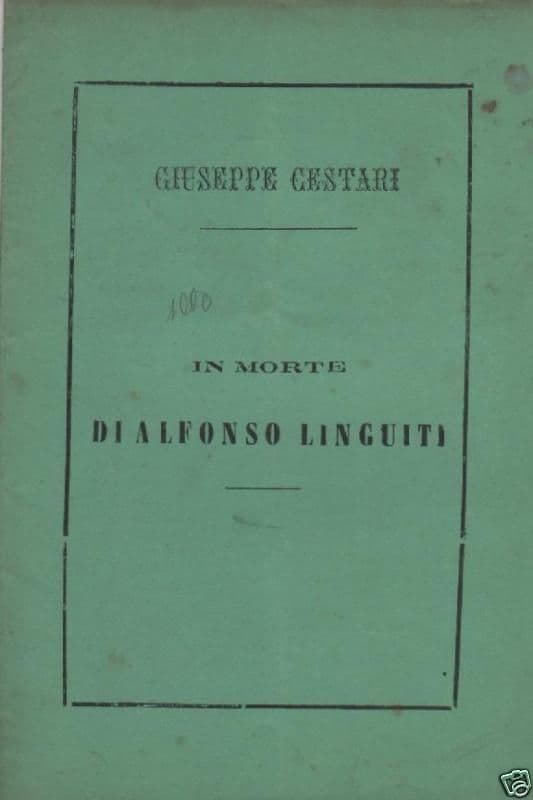 **Giuseppe Cestari** In morte di Alfonso Linguiti Professore nel Liceo Tasso di Salerno Napoli, Salvi, 1881 Cm. 22,5; pp. 7; bross. edit. (difetti) Interessante antica e rara edizione originale e d'epoca, con un componimento con all'interno dotte citazioni relative anche a Dante e al Mantovano, Salerno, Venosa, Grecia, ... Opera di interesse letterario storico-locale e bibliografico *rarissimo, **nessun esemplare noto** nel sistema bibliotecario nazionale.* Buona conservazione generale, segni e difetti d'uso e d'epoca, diffuse fioriture, difetti marginali.