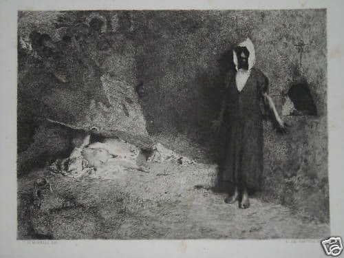 Tentazione di S. Antonio La bella e celebre opera del più noto artista napoletano dell'Ottocento, Domenico Morelli, in una magnifica incisione eseguita dall'abile artista incisore pure napoletano G. De Sanctis. Incisione originale all'acquaforte antica, e d'epoca, impressa su carta pesante, con magnifica inchiostratura; belle grandi dimensioni, misura cm.33x39 circa (l'impronta della lastra di rame servita per la stampa, esclusi i larghi margini bianchi irregolari e rifilati diseguali), cm. 21,5x29 (la parte figurata); databile alla seconda metà dell'800. Opera di interesse artistico collezionistico e decorativo *per collezionisti e cultori dell'arte italiana e napoletana dell'Ottocento.* Discreta conservazione generale, segni e difetti d'uso e d'epoca, diffuse fioriture, difetti vari e gore marginali, **meritevole di essere inserita sotto passpartout ed incorniciata.** *(l'immagine allegata raffigura un particolare dell'intero foglio)*