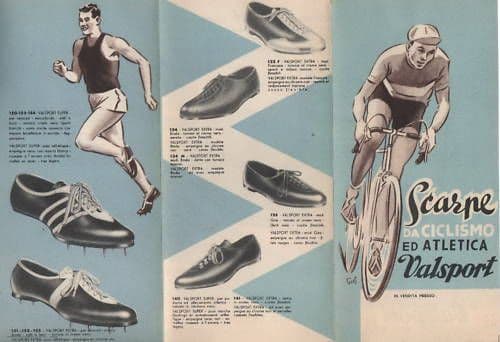 **Valsport *Scarpe da ciclismo ed atletica* Interessante pieghevole pubblicitario della nota ditta produttrice di scarpe ad uso sportivo, in particolare per l'atletica e il ciclismo, con raffigurazione di un ciclista mentre corre sulla sua bicicletta, e all'interno alcuni esemplari di scarpe, come pure raffigurato un atleta podista e alcune scarpe ad uso di velocisti, con anche scarpe chiodate.  Misura circa cm. 20,5x29,5 (pieghevole disteso o aperto); databile alla metà del '900; impresso dalla tipo-litogr. Palladio (Vicenza) Illustrazione firmata: Gios Di interesse collezionistico per le varie tematiche collegate Buona conservazione generale, usuali segni d'uso o d'epoca, inevitabili piegature, meritevole anche di essere inserito sotto passpartout ed incorniciato.**