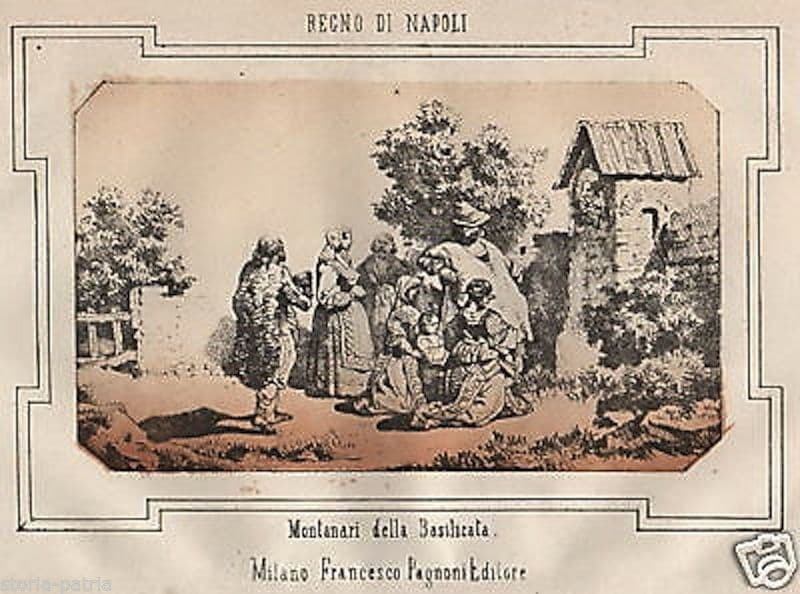 Regno di Napoli Montanari della Basilicata *Interessante antica veduta con uno scorcio paesaggistico meridionale (della Basilicata o Lucania), con alcune persone o viandanti -uomini donne e bambini- nei loro tipici abiti popolari, fermi davanti ad una edicola devozionale;* *litografia originale a colori, antica e d'epoca,* *misura cm. 25,5x17 circa (l'intero foglio, compresi i margini bianchi irregolari e diseguali); edizione Pagnoni (Milano); in origine tavola illustrativa di un'opera storico geografica della metà dell'800 (1857)* Di interesse artistico, folklorico, storico-locale, collezionistico, decorativo Buona conservazione generale, usuali segni o difetti d'uso e d'epoca, sparse fioriture, margini irregolari, **meritevole di essere inserita sotto passpartout ed incorniciata.** *(l'immagine allegata raffigura un particolare dell'intero foglio, eventuali ulteriori informazioni a richiesta)*