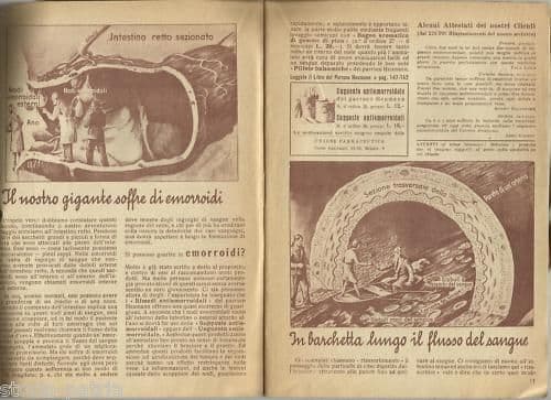Compieremo Un viaggio attraverso il corpo umano E... *Racconteremo tutto quello che ivi vedremo* Milano, Heumann, 1932 Cm.21,5; pp. 34; senza legatura Interessante edizione antica e d'epoca, pubblicazione periodica propagandistica e pubblicitaria della Heumann e della casa farmaceutica "Unione Farmaceutica", *con pubblicizzato in copertina posteriore (illustrata) il libro del parroco Heumann sui suoi metodi di cura, ma anche altre pubblicazione dello stesso autore;* *e con anche presente il calendario dell'anno1933* *e tabelle su calcoli vari (computazione degli interessi, pesi e misure), targhe automobilistiche, tariffe postali e dei pacchi, ...* *ma argomento principale della presente pubblicazione è l'ideale viaggio attraverso il corpo umano, una spedizione avventurosa in cui tre ricercatori entrano nel corpo di un uomo gigante, attraverso la sua grande bocca,* *per poi calarsi nell'intestino, dallo stomaco, al fegato, alla bile,...e passo per passo vengono segnalate le principali patologie a carico degli organi visitati e ovviamente pubblicizzati contestualmente anche i farmaci dell' Heumann;* *la visita tocca anche l'estremo intestino (il retto) e l'esame delle emorroidi,* *e poi su una barca si scorre sul flusso sanguigno, evidenziando anemie e clorosi,* *si giunge anche al rene e alle patologie urologiche di reni e vescica,* *come pure si raggiungono le varici della gamba e le parti ulcerate,* *e ancora nei muscoli reumatizzati, e nella pelle (con le patologie usuali da erpes)* *evidenziata anche la sclerosi delle arterie (arteriosclerosi)* *e il sistema nervoso e le cellule neurologiche del cervello* *infine il viaggio termina con l'apparato bronchiale e polmonare, l'asma, il catarro,...e con l'esame della porta di ingresso dei bacilli, ossia bocca o cavo faringeo;* *il tutto con ampio apparato illustrativo!* Opera di interesse specialistico, medico, farmaceutico, artistico, pubblicitario, bibliografico Buona conservazione generale, segni e difetti d'uso e d'epoca, diffuse fioriture e difetti vari marginali.