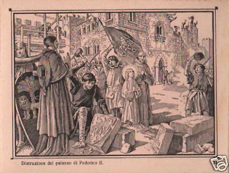 Distruzione del Palazzo di Federico II Interessante e animata raffigurazione, storica e devozionale, con Santa Rosa accompagnata da un frate e sotto il vessillo pontificio, si aggira tra alcuni operai e soldati, alcuni intenti a demolire le insegne federiciane che ornavano il palazzo reale; visibile anche un alto prelato, forse un Papa dell'epoca, e uno scudo militare su cui sono effigiate le insegne araldiche simboleggiate da una palma e un leone; bella stampa antica, in origine edita quale tavola illustrativa di un'opera relativa alla agiografia della nota Santa viterbese; misura cm. 9,5x12 circa (intero foglio, compresi i margini bianchi diseguali); databile alla prima metà del '900 (circa anni '30 ?) Di interesse artistico, storico-locale, devozionale, collezionistico Buona conservazione generale, segni e difetti d'uso e d'epoca, immagine impressa al recto del foglio, verso bianco; ***meritevole di essere inserita sotto passpartout ed incorniciata.*** * * * Il 27-giu-17 alle 19:47:55 CEST, il venditore ha aggiunto le seguenti informazioni sull'oggetto: