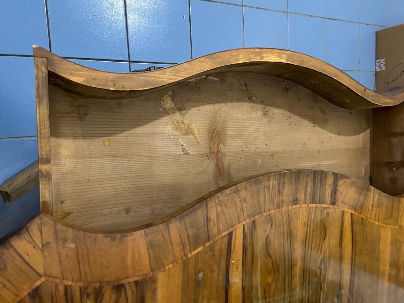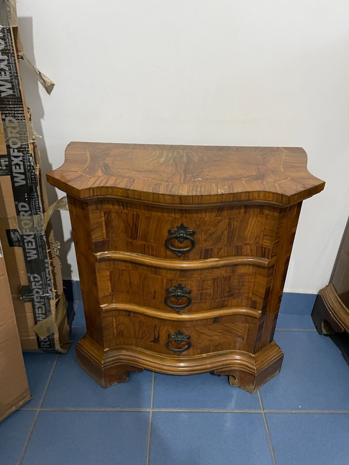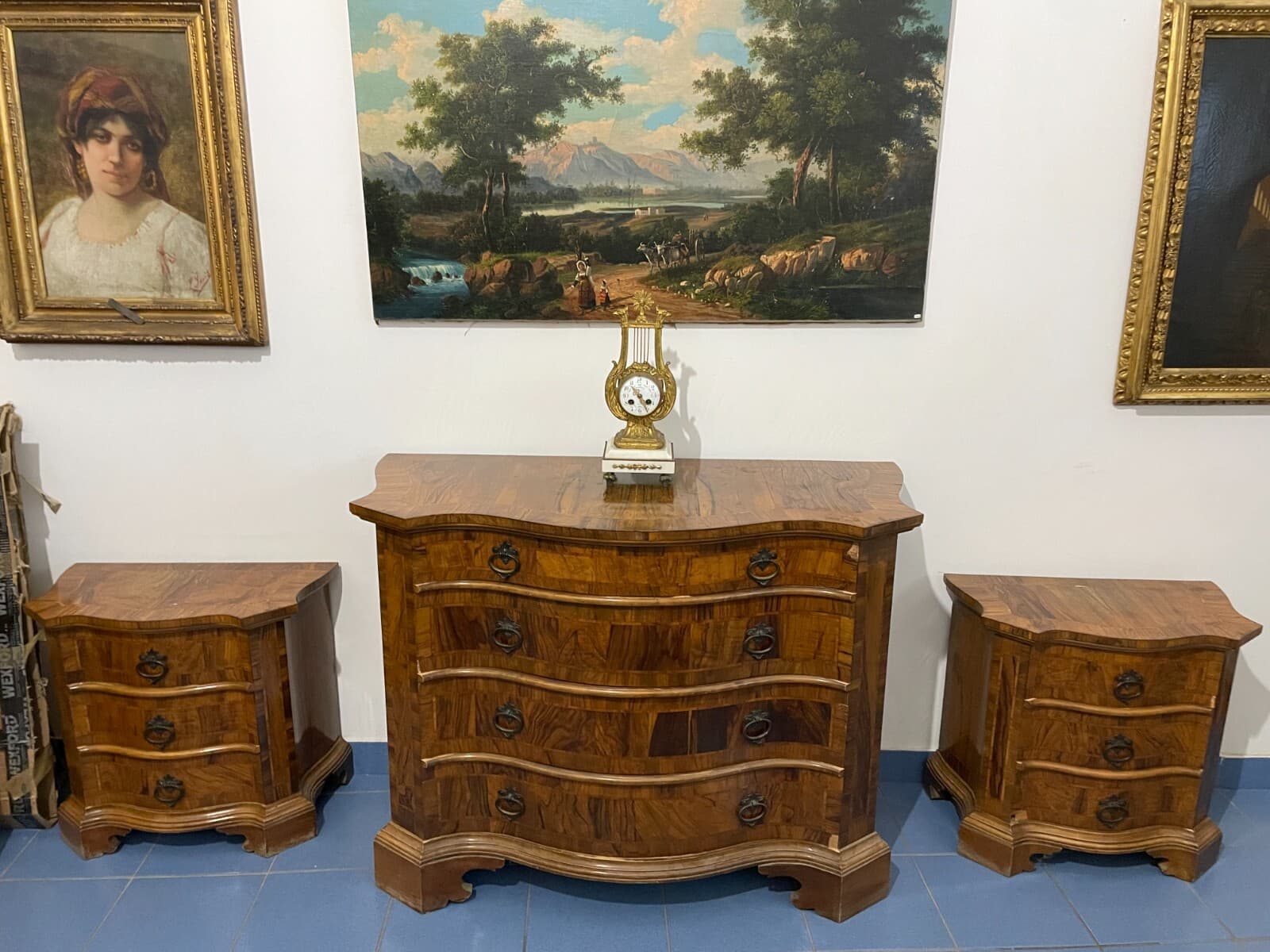 Insieme composto da un comò e due comodini, un trittico da camera da letto utilizzabile anche in contesti differenti come ingressi o soggiorni. Ogni elemento si distingue per le dimensioni contenute, ideali per ottimizzare piccoli spazi. Il set è di **manifattura artigianale** con frontale sagomato, interamente realizzato in legno e arricchito da una placcatura in noce. Risalente alla prima metà del '900 (*Italia*, circa anni '30). Dimensioni: * **Comò**: 125x56x90 cm circa. * **Comodini**: 65x35x61,5 cm ciascuno. L'oggetto presenta segni di usura, ossidazioni e difetti dell'impiallacciatura che richiedono interventi di restauro professionale o lucidatura.