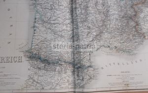 Mappa geografica antica della Francia, a cura di C. Graf, pubblicata dal Weimar Geographisches Institut tra il 1860 e il 1880. La carta raffigura dettagliatamente il territorio francese, incluse la Costa Azzurra, Nizza, Marsiglia, Bordeaux e Parigi.
