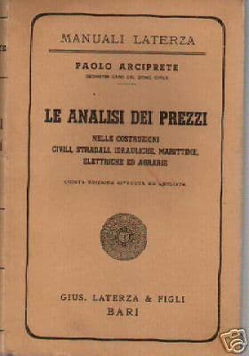 P. Arcipreti Le analisi dei prezzi *Nelle costruzioni civili, stradali, idrauliche, marittime, elettriche ed agrarie* Bari, Laterza, 1949 Cm. 16, pp. 383, cartonato Interessante volume di editoria scientifica della Laterza, relativo all'analisi dei prezzi per la esatta determinazione dell'importo di un qualsiasi progetto, per la risoluzione di eventuali vertenze fra imprese e stazioni appaltanti e per la verifica e revisione dei prezzi contrattuali. L'ampio e articolato contenuto è diviso in tre parti: *Preliminari relativi ai materiali da costruzione* *(trasporti, distanze e costo medio dei detti materiali, loro misurazione, rendimenti, prezzi elementari e simili…)* *Analisi degli elementi* (materiali, tagli scavi, demolizioni ed abbattimeni, carichi, trasporti, scarichi, …murature di pietrame, di malte e calcestruzzi, di tufo, di laterizi, a secco, …conglomerati cementiti,… pavimentazioni, intonaci, …opere in legno,…in ferro,…soffitti, tetti,.. cucine, latrine, pozzi, …. Ascensori termosifoni,… impianti elettrici,…opere agrarie,…) *Analisi per compenso a corpo* Opera di interesse specialistico tecnico bibliografico *Utile a ingegneri, idraulici, capimastri, tecnici agrari* Buona conservazione generale, segni o difetti d'uso e d'epoca.