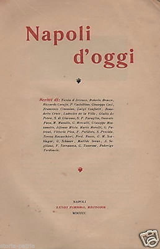 (AA.VV.) Napoli d'oggi Napoli, Pierro, 1900 Cm. 23,5; pp.447; senza legatura. Impossibile poter dare una sintesi dell'ampia trattazione di questo grosso volume, dedicata alla Napoli fin de siecle, al suo folklore, all'arte, la musica, il teatro, gli uomini celebri, l'archeologia, la ristorazione,... il tutto attraverso gli scritti di numerose personalità della cultura locale, da Roberto Bracco a Riccardo Carafa, D'Arienzo, Castellino, Giuseppe Ceci, Cimmino, Conforti, Croce, Faraglia, Fava, Mercalli, Mezzanotte, Pica, Miola, Morelli, Verdinois,Ravaschieri,.... e per avere una idea del contenuto estrapoliamo dall'indice i seguenti capitoli: *Il mare, Il Vesuvio, Pompei, Cuma, Pulcinella, Piedigrotta, Il Museo Nazionale, La Pinacoteca del Museo Nazionale, L'aristocrazia, Le voci di Napoli, Vico e la filosofia a Napoli, La cultura a Napoli, L'Archivio di Stato, Psicologia di via Toledo, Le chiese, La musica, Lo scugnizzo, Passeggiate e fontane pubbliche, Il Museo S. Martino, Le biblioteche, Trattorie popolari napoletane, I pittori a Napoli, Lo studente, L'Istituto Casanova, I teatri, L'Albergo dei Poveri, Il Museo Artistico Industriale, Editori di musica, L'Istituto Ortopedico, Napoli stazione termale d'inverno* con anche molte illustrazioni! Opera di interesse storico-locale artistico e bibliografico Discreta conservazione generale, segni e difetti d'uso e d'epoca, sgualciture marginali, sparse fioriture, dorso rotto, senza copertine e pertanto degno di rilegatura.