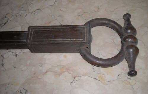 Inusuale antico attrezzo *in legno, con asta terminante ad una estremità con una artistica maniglia sagomata e intagliata o tornita,* *VfZg~~_35.JPG)* *mentre l'estremità opposta porta un supporto trasversale in legno congiunto all'asse centrale con due artistici riccioli o volute,* *attrezzo forse utilizzato in antico quale accessorio per macchina musicale (forse organo o pianola o pianoforte ?), o forse anche per complemento di arredo (per tende ?), o per altri utilizzi non ben ipotizzabili (una estremità veniva fissata a un supporto, e tirando la maniglia poteva essere azionato un tirante interno all'asse, di cui è visibile un moncone che fuoriesce all'esterno)* ** *comunque oggetto interessante e inusuale,* *oggi anche riutilizzabile per vari altri usi;* k!EGk~$(KGrHqYOKiwEwRToRkPCBMT-Cq)mIw~~_35.JPG) misura circa cm. 55 (lunghezza totale, compresa la maniglia), cm. 35 circa (lunghezza della fascia trasversale di supporto), l'asse centrale è di forma quadrangolare e misura circa cm. 3x3 (cm. 4,5x4,5 nella parte estrema, unita alla maniglia); interamente in legno, legno di pregio, con parti in legno massello e asta in legno impiallacciato; legno con venature che richiamano il palissandro (?); presente una filettatura -probabilmente ad intarsio con filetto metallico- che scorre sia frontalmente che lateralmente sull'asse portante; esemplare databile alla metà dell'800 (?) Decorativo e da collezione Discreta conservazione generale, segni e difetti d'uso e d'epoca, alcune parti allentate, spellature della impiallacciatura in particolare lateralmente verso la estremità con il supporto trasversale, rotto e incompleto il moncone del tirante (forse inizialmente più lungo), il tutto così come dalle immagini allegate, così come rinvenuto in una vecchia soffitta di famiglia, ancora da pulire e lucidare e restaurare. (le immagini allegate raffigurano alcuni perticolari dell'intero oggetto, eventuali altre informazioni a richiesta) [](https://img853.imageshack.us/i/bysqqqbmkkgrhqeokjmemdb.jpg/ "ImageShack - Image And Video Hosting") Uploaded with [ImageShack.us](https://imageshack.us)