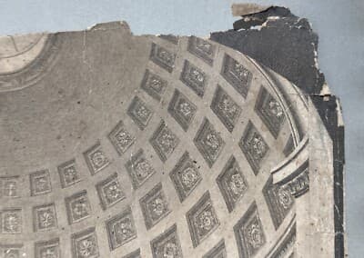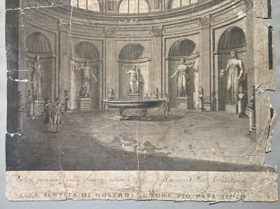 Grande veduta prospettica della **Sala Rotonda** del **Museo Pio-Clementino**, dedicata a **Papa Pio VI**. L'incisione documenta con precisione l'allestimento neoclassico della sala, incluse le sculture antiche disposte nelle nicchie, la pavimentazione a mosaico e la monumentale vasca centrale in porfido. * **Disegnatore**: **Francesco Maria Costa**. * **Incisore**: **Vincenzo Feoli**. * **Tecnica**: Incisione originale all'acquaforte. * **Epoca**: Fine XVIII - inizio XIX secolo. * **Dimensioni**: 58 x 44 cm circa (foglio). * **Localizzazione**: Musei Vaticani, *Roma*. L'esemplare si presenta in condizioni modeste con evidenti segni del tempo, fioriture diffuse, bruniture e strappi marginali. L'opera è meritevole di un attento restauro conservativo.