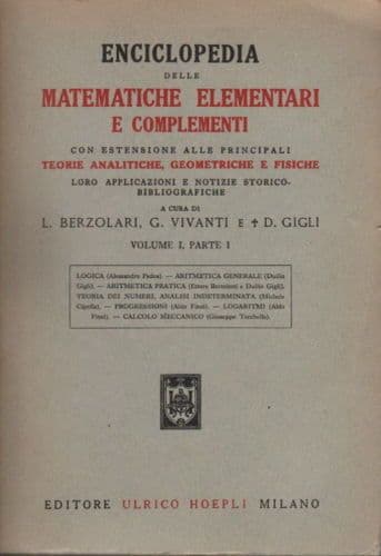 Berzolari L. - Vivanti G. - Gigli D. (e altri) Enciclopedia delle matematiche *Elementari e complementi* *con estensione alle principali teorie analitiche, geometriche e fisiche* *loro applicazioni e notizie storico-bibliografiche* *.....* Milano, Hoepli, (circa 1957-1959) Cm. 25, pp.450+609+634+572+964+1037+218, bross. edit. (difetti) Interessante monumentale edizione, imponente trattazione specialistica impressa a cura del noto editore milanese Hoepli, specializzato nei settori dell'editoria tecnica e scientifica, opera in ben sei grossi volumi distinti (vol.1 in due tomi, vol.2 in due tomi, vol. 3 in tre tomi), dei quali ovviamente è impossibile poter dare una qualsiasi sintesi, e solo spulciando dai vari sommari evidenziamo i seguenti contenuti, spesso dovuti a studiosi vari ognuno specialista di particolari tematiche; scorrendo dal primo all'ultimo tomo, troviamo *Logica, aritmetica generale, aritmetica pratica, teoria dei numeri, analisi indeterminata, progressioni, logaritmi, calcolo matematico* *Calcolo combinatorio, elementi della teoria dei gruppi, equazioni lineari, funzioni razionali, equazioni, prodotti infiniti, analisi infinitesimale, ....* *Fondamenti di geometria, teoria della misura, geometria del triangolo, poligoni e poliedri, problemi geometrici, trigonometria,...* *Massimi e minimi, calcolo vettoriale, geometria proiettiva e descrittiva, geometrie non euclidee, geometria elementare e matematiche superiori, .....* *Sistemi e unità di misura, teoria delle dimensioni fisiche, calcolo vettoriale, calcolo matriciale, meccanica razionale, statica grafica, fisica classica, cosmografia e meccanica celeste, ottica geometrica, cristallografia e fisica cristallografica, topografia, strumenti topografici, elementi di geodesia, teoria della relatività, materia irraggiamento e fisica quantica* *Approssimazioni numeriche, calcolo delle probabilità, metodologia statistica, matematica finanziaria, matematica attuariale, matematica ricreativa, storia della matematica elementare, caratteri e indirizzi della matematica moderna, storia del pensiero fisico, questioni didattiche, sui fondamenti della geometria* *Metodologia statistica: integrazione e comparazione dei dati* Opera di interesse scientifico specialistico bibliografico Buona conservazione generale, segni e difetti d'uso e d'epoca, piegature e sgualciture o strappetti a qualche brossura, ma esemplare ancora parzialmente a fogli chiusi, probabilmente mai usato o mai sfogliato.