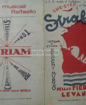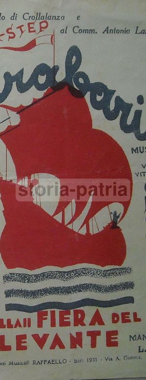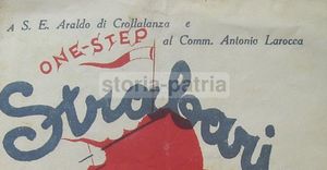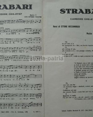 Rara edizione d'epoca dello spartito musicale Strabari, canzone in stile one-step. Composta da Ettore Recchimurzo e musicata da Vito Vittorio Crocitto, questa pubblicazione fu probabilmente realizzata in occasione della II Fiera del Levante di Bari.