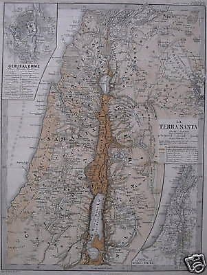 LA TERRA SANTA Bella antica e interessante mappa geografica, comprendente la Palestina, con evidenziate a colori la Giudea, Samaria, Galilea, il Mar Morto, e altre regioni confinanti come la Fenizia, il Regno di Basan, Perea, ... e con numerosissimi antichi toponimi relativi a piccole e grandi località; in alto a sinistra, in un riquadro, è invece evidenziata la mappa di Gerusalemme, con la pianta della città e i suoi dintorni tra cui il Monte degli Olivi, il Monte dello Scandalo, il Villaggio di Siloe, il Monte del Cattivo Consiglio,... in altro riquadro in basso a destra è invece illustrata più in generale la "Carta del territorio delle dodici tribù". Incisione originale antica, redatta da E. Berghaus, per un atlante storico-geografico della seconda metà dell'800 (Stieler). Misura cm.30x24 circa (l'intero foglio, compresi i piccoli margini bianchi diseguali)  Di interesse culturale storico-geografico e collezionistico Buona conservazione generale, segni e difetti d'uso o d'epoca, sparse fioriture, difetti marginali, vecchi scarabocchi al verso con anche un disegno caricaturale a soggetto militare e sporco di acquerelli; degna di essere inserita sotto passpartout ed incorniciata. *(le immagini allegate sono particolari dell'intero foglio)*