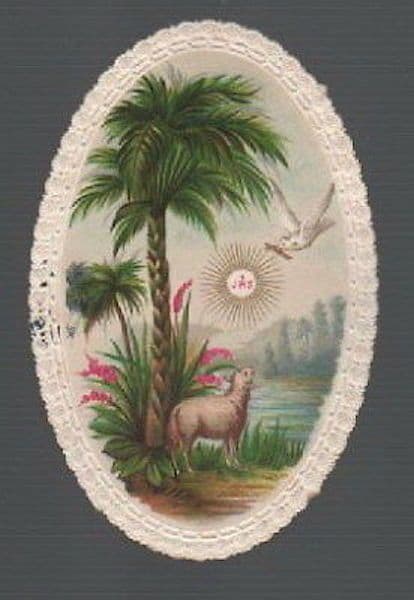 Bella inusuale raffigurazione Antico "santino", a colori, con un paesaggio lacustre e con palme, una pecora (simboleggiante l'Agnello di Dio) e una colomba in cielo, e un sole con raggi dorati in cui è iscritto JHS; *esemplare di forma ovale e con elegante e sobria merlettatura;* originale antico e d'epoca, stampa cromolitografica su carta, di circa cm. 9,5x6 ; stampa a colori al recto, verso bianco; databile presumibilmente al primo '900. Di interesse artistico, devozionale, collezionistico Discreta conservazione generale, segni e difetti d'uso e d'epoca, segni scuri visibili al recto e al verso, probabilmente segni di sporco da inchiostro; ***esemplare meritevole anche di essere inserito sotto passpartout ed incorniciato.***