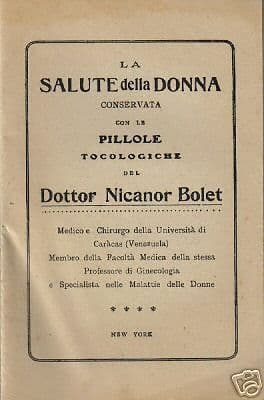 **La salute della donna** **Conservata con le pillole tocologiche del** ***Dottor Nicanor Bolet*** Medico chirugo..... New York, s.i.t., s.d. (primo '900) Cm. 17, pp.28, bross. edit. **Interessante rara antica pubblicazione, pubblicitaria delle pillole medicinali inventate dal dottor Bolet, per molte applicazioni terapeutiche in campo ostetrico-ginecologico, ...dalle irregoli mestruazioni alle coliche uterine, dismenorree, clorosi, anemie, leucorrea, ingorgo della matrice, ....ma anche riferimenti a isterismi, aborti, varici e trombi,...** **con gli immancabili giudizi espressi da vari specialisti internazionali.** Di interesse specialistico e collezionistico oltre che storico e bibliografico Buona conservazione generale, usuali segni o difetti d'uso e d'epoca, fioriture sparse.