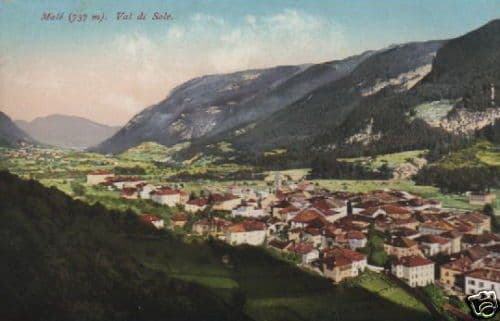 Malè Val di Sole *Bella e rara cartolina d'epoca, a colori, raffigurante una veduta panoramica di questa deliziosa località montana, con il paesino immerso nel verde delle montagne circostanti.* Misura cm. 9x14 circa; ediz. J.F. Amonn (Bolzano); non viaggiata; databile primo '900. Di interesse storico-locale fotografico e collezionistico Buona conservazione generale, usuali segni o difetti d'uso o d'epoca, impronte agli angoli per antico inserimento in album.