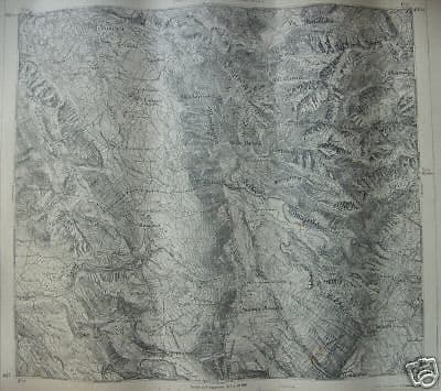**Caramanico *Chieti (Abruzzo)*** Interessante antica mappa topografica del territorio abruzzese -della provincia di Chieti- comprendente i dintorni di Caramanico, con anche Pacentro, Campo di Giove, Taranta Peligna, la montagna della Majella, Roccacaramanico, S. Vittorino, la Majelletta, Pennepiedimonte, Lama dei Peligni, Monte del Morrone, Lettopalena, ....e tantissimi altri toponimi relativi a numerosi piccoli paesi e varie altre località. *Mappa ben dettagliata, con anche la viabilità, i tratturi, le contrade,...* *      * Di interesse geografico storico-locale e collezionistico Cm.52x 58 circa (intero foglio, compresi i margini bianchi diseguali); edita per conto dell'Istituto Geografico Militare, "levata nel 1875...colle correzioni del 1897" Buona conservazione generale, segni e difetti d'uso e d'epoca, piegature per arrotolatura, sparse fioriture, timbro a secco di garanzia dell'istituto geografico militare; meritevole di essere inserita sotto passpartout ed incorniciata.