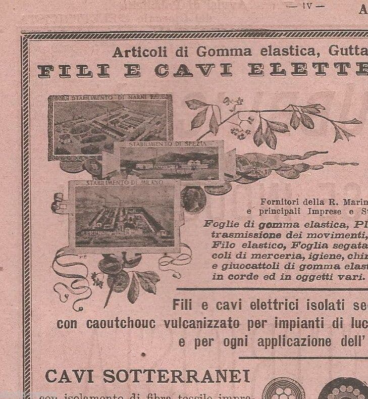 Pirelli & C. Milano *Fili e cavi elettrici isolati* *Articoli di gomma elastica, guttaperca ed amianto* *...* \----- Tecnomasio Italiano *Ing. B. Cabella & C.* *Milano* *Motori elettrici, macchine dinamo elettriche, lampade ad arco e ad incandescenza, amperometri, strumenti per misurazioni elettriche,...* Interessante antico foglio volante, pubblicitario delle due note aziende milanesi, specializzate nella tecnica e industria dell'elettricità, due spazi pubblicitari impressi sullo stesso foglio, ed entrambi anche figurati, la pubblicità della Pirelli porta illustrate alcune sezioni di cavi elettrici di vario spessore, con anche nella intestazione un fregio artistico-allegorico con alcune medaglie simboleggianti premi conseguiti a varie Esposizioni e tre minuscole vedute di stabilimenti industriali (Milano, Spezia, Narni); lo spazio pubblicitario della Tecnomasio è invece illustrato con uno strumento tecnico, forse un motorino elettrico o una dinamo (vedi immagine allegata); foglio volante di carta leggera rosata, misura circa cm.26,5x18 (l'intero foglio, compresi i margini bianchi diseguali); foglio impresso al recto con le due suddette pubblicità, mentre al verso è impressa a piena pagina la pubblicità dell' "Elettricista"; esemplare databile al primo '900. Di interesse pubblicitario, specialistico tecnico-meccanico-ingegneristico, storico-locale, bibliografico Buona conservazione generale, segni e difetti d'uso e d'epoca, sgualciture o difetti vari marginali, foglio edito in origine quale inserzione pubblicitaria di una pubblicazione specialistica dell'epoca, dalla quale è stato poi estratto; meritevole anche di essere inserito sotto passpartout ed incorniciato. *(le immagini allegate raffigurano particolari dell'intero foglio, eventuali ulteriori informazioni a richiesta)* [](https://img822.imageshack.us/i/pirellitecnomasio9aa.jpg/) [](https://img695.imageshack.us/i/pirellitecnomasio9ac.jpg/)