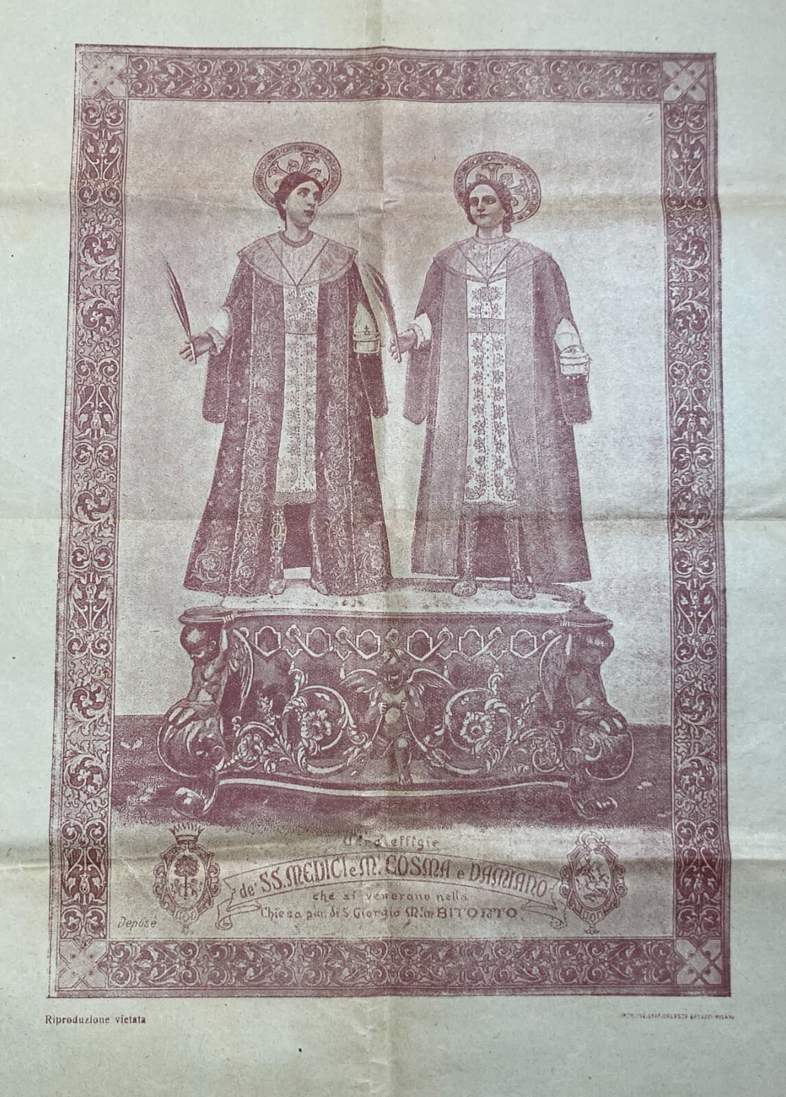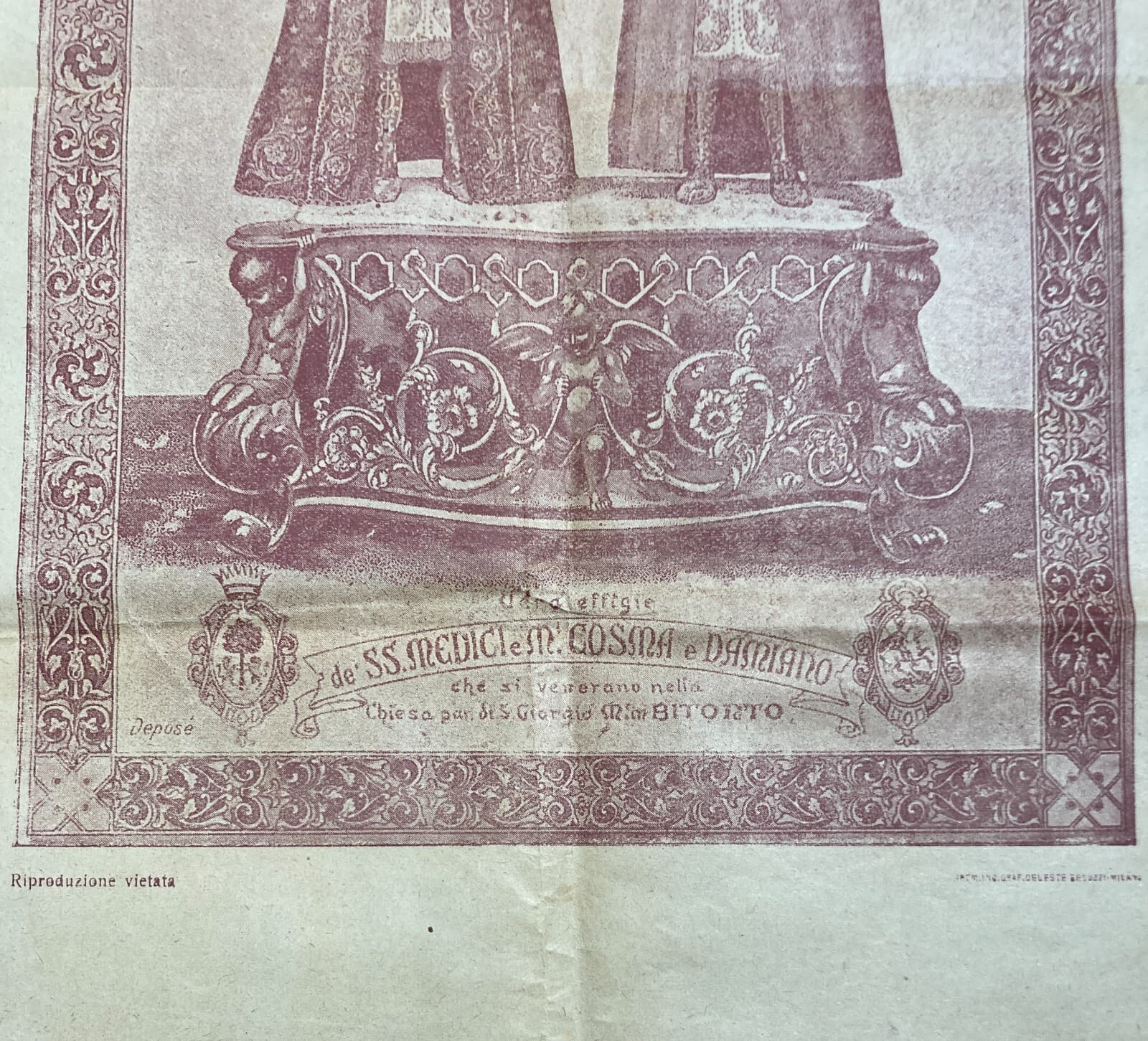 **M. SS. di Loreto** venerata nella chiesa di *San Francesco di Paola* nella città di *Vasto*, dedicata per devozione della famiglia **Sergiacomo**.\n\nAntica edizione di stampa popolare devozionale raffigurante l'iconografia della **Madonna di Loreto**, ispirata a un'opera d'arte storicamente conservata presso la chiesa di *San Francesco di Paola* a *Vasto* (*Chieti*, *Abruzzo*).\n\n* **Tecnica**: Acquaforte originale su carta.\n* **Dimensioni**: Circa 9,5x6,5 cm (foglio intero).\n* **Epoca**: Metà del XIX secolo (circa 1850).\n* **Dettagli**: Unico foglio impresso al recto, verso bianco. Possibile opera di incisore locale abruzzese o di scuola napoletana (es. **Scafa** o **Apicella**).\n\nEsemplare di notevole interesse storico-locale e collezionistico. Stato di conservazione discreto con segni del tempo, fioriture sparse e bruniture marginali.