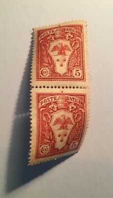 Insieme di due francobolli d'epoca da collezione delle **Poste Vaticane**, ciascuno dal valore nominale di 5 centesimi. Gli esemplari presentano motivi araldici e appaiono in ottimo stato di conservazione, presumibilmente mai usati (nuovi). * **Interesse**: Filatelico, araldico e storico locale. * **Stato di conservazione**: Discreto, con lievi segni del tempo e difetti marginali visibili nelle immagini allegate. * **Soggetto**: Simboli araldici dello *Stato Pontificio*.