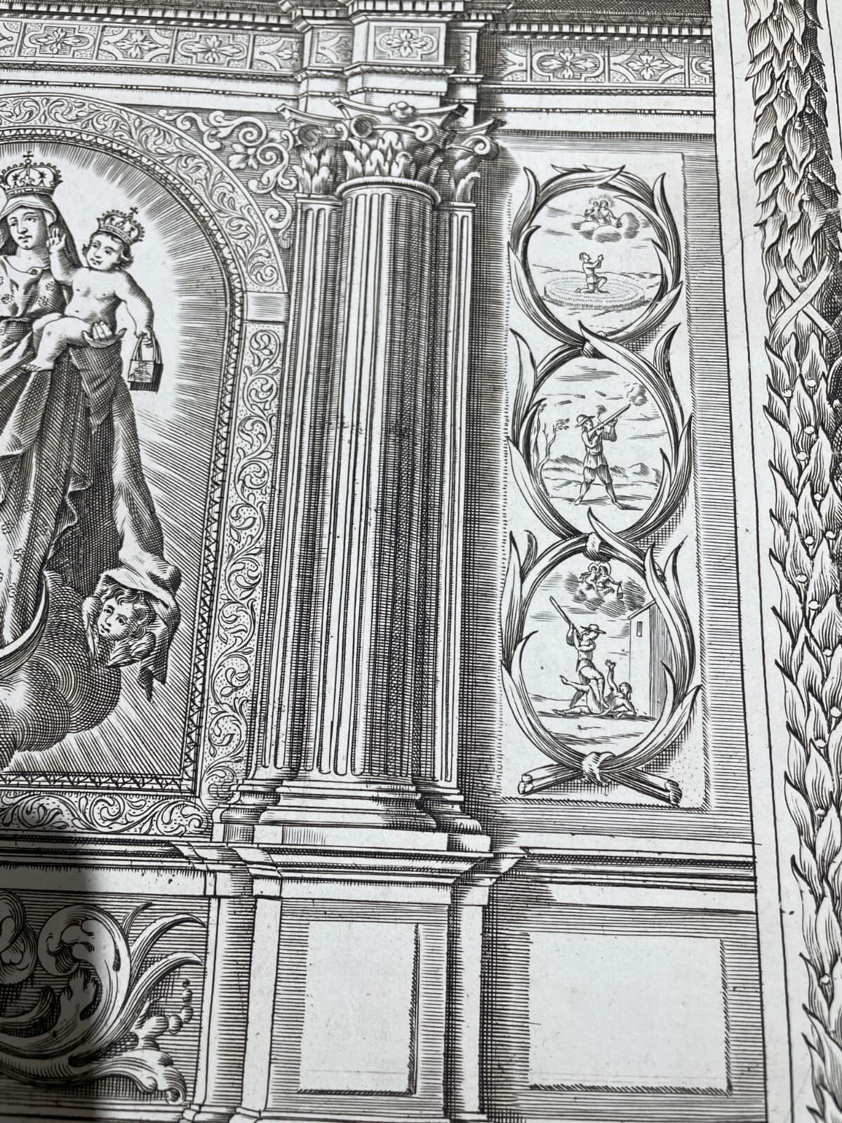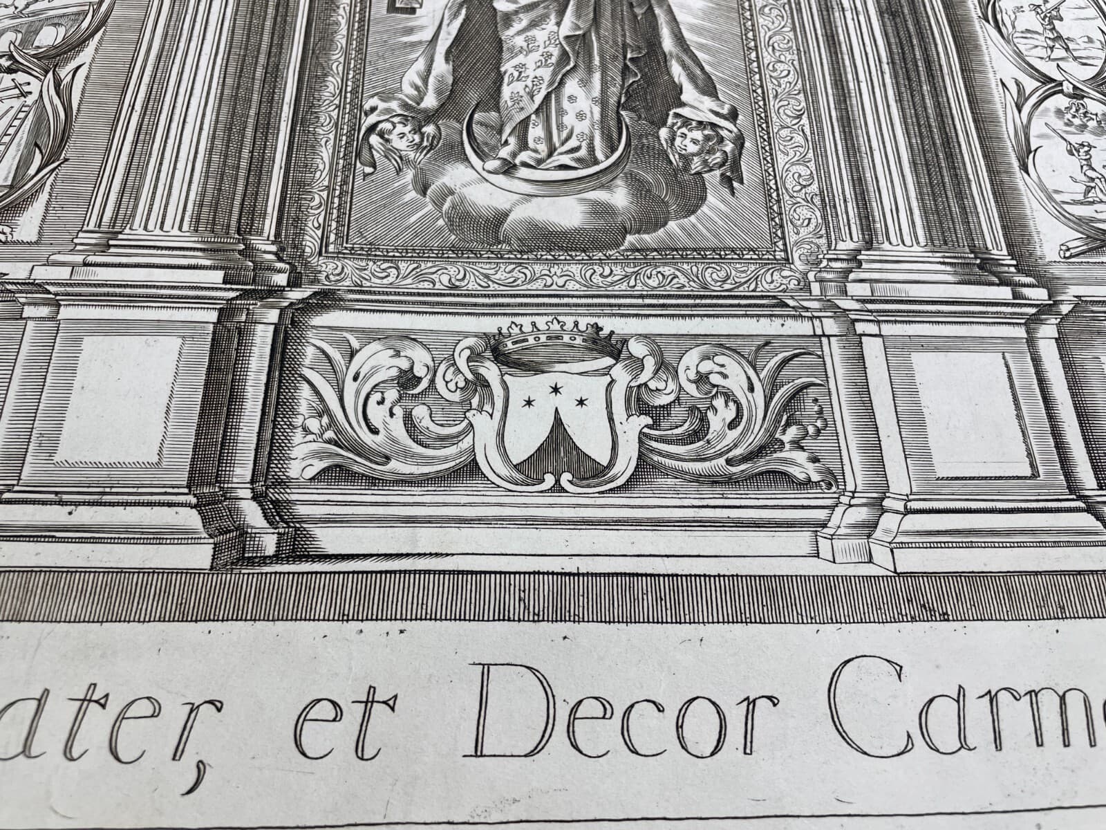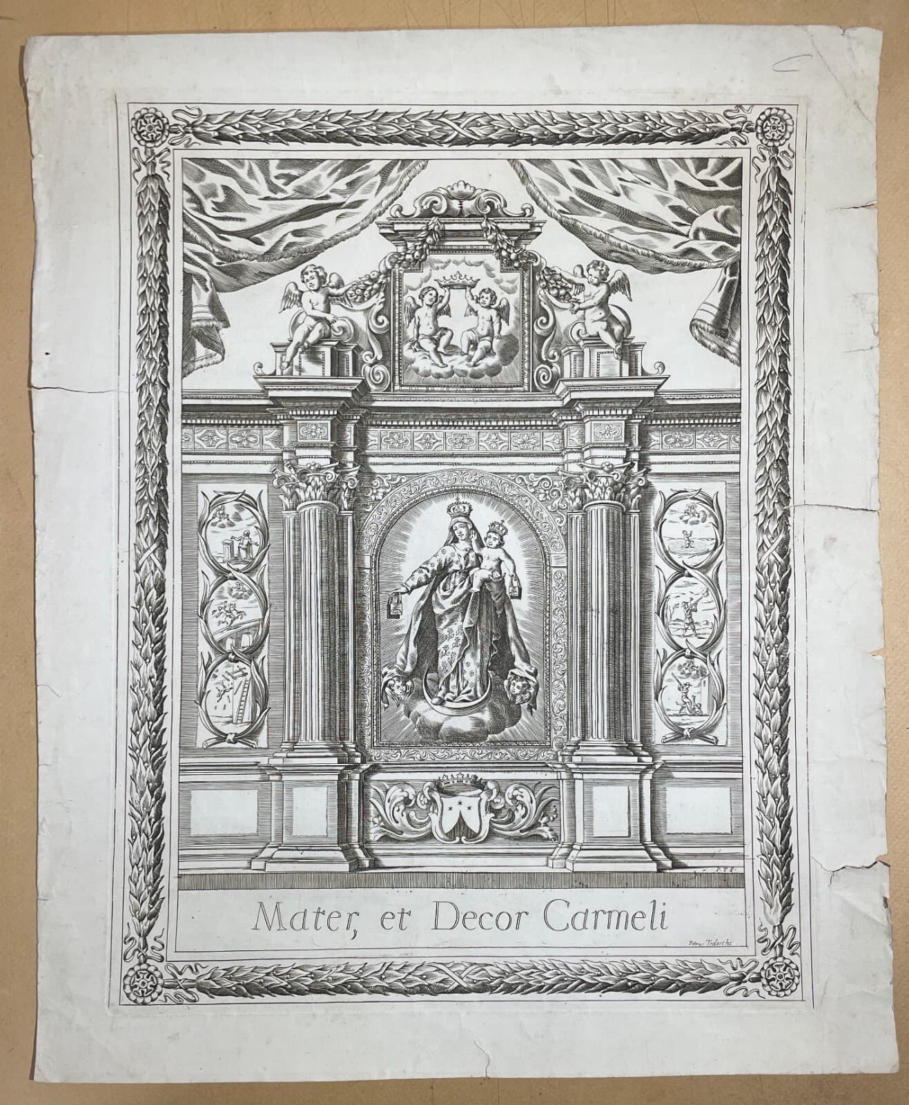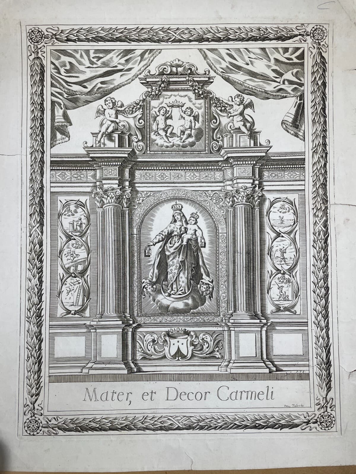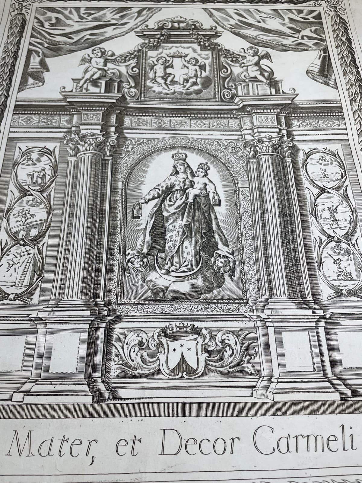 **Mater Salvatoris**. Antica incisione di carattere allegorico e devozionale, raffigurante al centro la Madonna con il bambino entro una cornice simbolica legata al martirio di Gesù (corona di spine, scala, croce, strumenti della passione e il sacchetto dei trenta denari). * **Soggetto**: In basso, scene della natività e della Sacra Famiglia. * **Dimensioni**: Foglio circa 13x9 cm; area impressa 8x5 cm. * **Tecnica**: Incisione su carta, opera non firmata ma attribuibile ad artista italiano (probabilmente l'incisore **Colombo**). * **Epoca**: Seconda metà del XIX secolo (circa 1880), probabilmente nata come tavola illustrativa per una pubblicazione religiosa. * **Stato di conservazione**: Buono, con segni d'epoca, lievi fioriture e difetti marginali.
