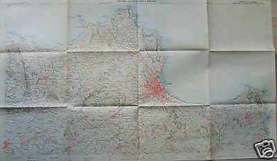 Palermo, la Conca d'Oro e dintorni Interessante grande mappa cartografica di parte della Sicilia, comprendente territori della provincia di Palermo, con visibili innumerevoli toponimi relativi a piccole o grandi località costiere e dell'entroterra, ma è anche apprezzabile la conformazione geofisica e la viabilità, fiumi ..., il tutto ovviamente impossibile da sintetizzare, ... *tra esse Palermo, Isola delle Femmine, Carini, Monreale, Montelepre, Giardinello, Borgetto, Parco, Belmonte, Misilmeri, Villabate, Casteldaccia, Bagheria, Ficarazzi, Mondello, Boccadifalco, Torretta,...* Grandi dimensioni, misura cm. 46,5x 80 circa (intero foglio disteso, compresi i margini bianchi diseguali); edita dal TCI, a cura del Corbellini, probabilmente per una guida turistica o di viaggio del primo '900 o anni '30. Di interesse storico geografico collezionistico e decorativo Meritevole di essere montata sotto passpartout ed incorniciata Buona conservazione generale, segni e difetti d'uso e d'epoca, numerose piegature inevitabili per renderla anche tascabile.