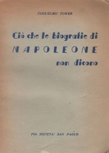 Guglielmo Tower Ciò che le biografie di Napoleone non dicono Alba, Pia Società S. Paolo, 1946 Cm.22, pp.268, bross. edit. (sciupata) Interessante edizione antica e d'epoca, gustoso volume con all'interno numerose riflessioni e ipotesi dell'autore inerenti la vita e la biografia dell'illustre Imperatore francese, e sopratutto i rapporti avuti da Napoleone con Roma e il Papato, la Chiesa e la Religione, il tutto di impossibile sintesi, ma scorrendo l'indice evidenziamo capitoli su: *Napoleone e i due Papi* *Campagna di rapine* *Uccisione del generale Duphot* *Il Papato è finito!* *Bonaparte si accorda col Papa ma lo inganna* *Incoronazione dell'Imperatore e umiliazioni del Papa* *Il blocco continentale* *Prepotenze di Napoleone verso il Papa* *Ordine di occupare Roma* *L'unica arma del Papa* *L'arresto del Papa* *Il viaggio del Papa prigioniero* *Napoleone ha paura* *La prigionia a Savona* *Napoleone tortura il Papa...* *Il Concilio nazionale* *La spedizione in Russia* *La benedizione del Papa* *Il Papa e la prigionia di Napoleone* *L'abdicazione* *Infedeltà e abbandono* *Circondato da spie* *Il medico personale* *Gli eretici* *Il figlio di Napoleone* *Idee religiose di Napoleone* *Meriti di Napoleone verso il Papa e il clero* *Vita religiosa di Napoleone* *Il Papa e la famiglia di Napoleone* *....* Opera di interesse culturale storico bibliografico Buona conservazione generale, segni e difetti d'uso e d'epoca, strappi sgualciture e rotture marginali e al dorso della brossura, ma esemplare con interno molto ben conservato e ancora a fogli chiusi, eventualmente meritevole meritevole di rilegatura. *(l'immagine allegata raffigura un particolare dell'intera copertina)*[](https://pages.ebay.it/turbo_lister/)