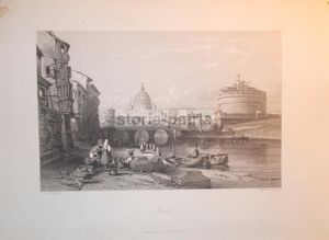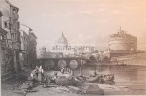 L'opera mostra il cupolone del Vaticano sullo sfondo, la fortezza di Castel Sant'Angelo sulla destra e antiche abitazioni lungo il Tevere. In primo piano, la scena è animata da pescatori e dalle caratteristiche acquaiole romane con le tipiche conche per il trasporto dell'acqua.