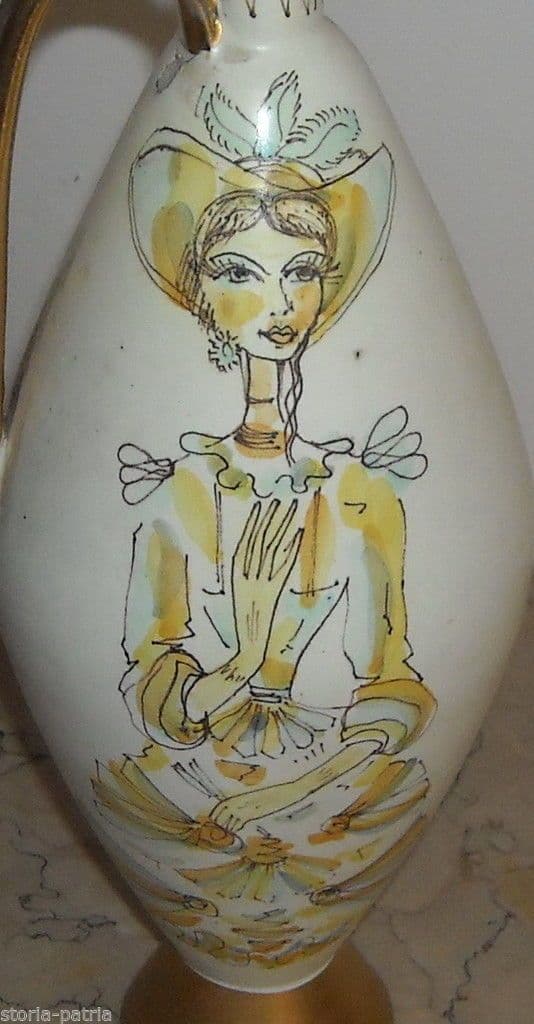 Miramare R. Elegante decorativa bottiglia, in ceramica modellata e decorata, con dipinta una figura femminile con cappello piumato, rifiniture dorate sia lungo l'orlo della apertura superiore e sia al manico e alla base; bottiglia in ceramica, probabilmente in origine ad uso bottiglia da liquore; belle dimensioni, misura circa cm. 27 (altezza) x circa cm. 11 (ampiezza massima); disegno e coloritura eseguita a mano con abilità e maestria, probabilmente opera di artista decoratore o ceramista italiano della metà del '900, forse di area emiliana o romagnola, essendo stata prodotta in tale regione, così come da firma presente sotto il fondo "Miramare R." (Miramare di Rimini ?); esemplare databile presumibilmente alla metà del '900. Di interesse artistico, decorativo, storico-locale, collezionistico Discreta conservazione generale, segni e difetti d'uso e d'epoca, lesioni alle due estremità del manico, sommariamente reincollato in passato per vecchia rottura, un paio di filature appena visibile nella parte bianca posteriore, complessivamente oggetto piacevole e decorativo, utile ad appassionati e collezionisti di ceramiche da liquore e ceramiche locali romagnole. *(le immagini allegate raffigurano particolari dell'intero oggetto, eventuali ulteriori informazioni a richiesta)* [](https://img195.imageshack.us/i/miramare5bb.jpg/) [](https://img29.imageshack.us/i/miramare5e.jpg/) [](https://img838.imageshack.us/i/miramare5ee.jpg/) [](https://img217.imageshack.us/i/miramare5a.jpg/)