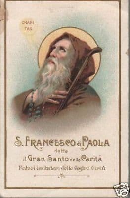 **S. Francesco di Paola** Bella raffigurazione del celebre Santo, detto "Il Gran Santo della Carità". Santino d'epoca, in stampa cromolitografica, databile fine '800 o primo '900 (al verso è la preghiera e la data 1898); misura cm. 11x7 circa. Di interesse artistico devozionale e collezionistico Buona conservazione generale, segni e difetti d'uso e d'epoca, vecchia gora laterale; **degno anche di essere montato sotto passpartout ed incorniciato.**