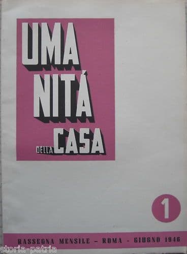 Umanità della Casa *Rassegna mensile a cura dell'Istituto Nazionale per le Case degli Impiegati dello Stato* **Roma, anno 1, n. 1 (Giugno 1946)** Cm.29, pp. 32, bross. edit. Interessante antica rivista d'epoca, raro primo numero pubblicato di questa pubblicazione periodica diretta da Pio Montesi, che aveva tra i suoi collaboratori Libero Bigiaretti, Adriano Olivetti, Mario Praz, Bruno Sargentini,... *fascicolo che in particolare contiene una presentazione a cura di Filippo Lupis* *e ancora* *Umanità della Casa (Pio Montesi)* *Ascoral (Franco Strumia)* *La politica edilizia della Gran Bretagna (V. Montezemolo)* *una veduta fotografica di un particolare di interno del Cinema Rivoli a Roma, da progetto dell'arch. Brando Savelli* *Sulla ricostruzione edilizia (Luigi Kambo)* *Resurrezione dello stile impero (Mario Praz)* *Come vorrei la mia casa: referendum* *Spinta del capitale privato all'attività edilizia (Virgilio Testa)* *Case a servizi centralizzati (A. M. Mazzucchelli)* *Affollamento nelle abitazioni in Italia prima della guerra (indagine statistica con analisi dei vari compartimenti regionali, dalla Liguria alla Puglia e Basilicata, Sicilia, Campania, Lazio, Abruzzo,...) (Salvatore Alberti)* *I libri nella casa (Libero Biagiaretti)* *Vetrina scientifica (con notizie librarie e bibliografiche)* *Casa mia (Giovanni Mariotti)* *Notiziario (con notizie da Napoli, Milano, dalla rivista Tracciati di Torino,...)* *Attività dell'Incis: aumento degli affitti, attività costruttiva* con anche alcune immagini illustrative [https://img691.imageshack.us/img691/639/umanit9b.jpg](https://img691.imageshack.us/img691/639/umanit9b.jpg) [https://img145.imageshack.us/img145/252/umanit9d.jpg](https://img145.imageshack.us/img145/252/umanit9d.jpg) Di interesse specialistico, architettonico, ingegneristico, edilizio, storico-locale, bibliografico Buona conservazione generale, usuali segni o difetti d'uso o d'epoca**.**