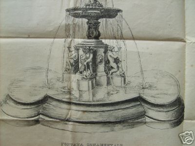 La Scopa *Giornale quotidiano - indipendente - umoristico con caricature* Chieti, 11 maggio 1891 Cm.50x35 circa (chiuso); pp.4 Interessante edizione antica e d'epoca, pubblicazione periodica abruzzese, testimonianza del clima politico-sociale dell'epoca (spesso il fervore politico locale generava una particolare e generosa fioritura della stampa periodica locale anche satirica); numerosi gli scritti contenuti, alcuni nel tipico dialetto locale abruzzese; *Esemplare edito in occasione della inaugurazione della **fontana** di Piazza Vittorio Emanuele, cerimonia a cui partecipò anche il Duca degli Abruzzi, con la cronaca locale della manifestazione;* all'interno del giornale, su entrambi i fogli e a piena pagina, sono raffigurante le fontane di Piazza Vittorio Emanuele e quella della Villa Municipale, in belle litografie originali, degne anche di essere montate sotto passpartout ed incorniciate.  tra le altre notizie, una di interesse teatrale, sulla Cavalleria Rusticana (del Mascagni) al Teatro Marrucino; e ancora ...sulle corse ippiche alla Civitella...sull'inaugurazione dell'acquedotto...sulla presenza in Chieti del pittore napoletano **Gaetano Esposito**, allievo del Morelli, chiamato per un ritratto ad una gentildonna locale. Di interesse storico-locale, artistico, folklorico, bibliografico *oltre che di particolare rarità collezionistica, come un po' tutti i giornali simili, spesso tirati in pochissimi esemplari, a limitata diffusione locale,* ***probabilmente oggi unico esemplare superstite.*** Buona conservazione generale, segni e difetti d'uso o d'epoca, sparse fioriture e difetti vari marginali o così come visibili nelle immagini allegate; strappo e abrasione alla testata, numerose piegature.