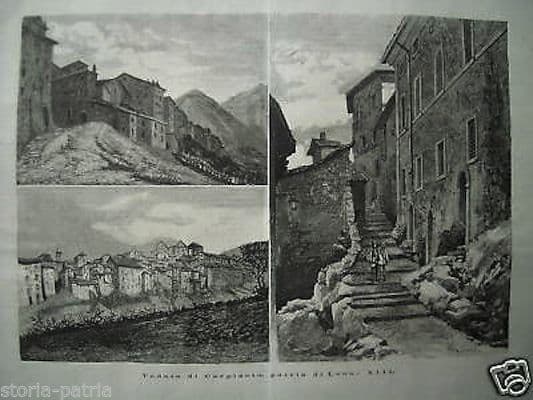 Veduta di Carpineto Patria di Leone XIII Interessante antica stampa con tre vedute del noto paese della campagna romana, *due vedute panoramiche e uno scorcio di una stradina dove sono visibili anche due uomini davanti ad una palazzina, uno dei quali sembra avere una banda trasversale (forse il Tricolore che caratterizza il sindaco del paese ?), e l'altro forse uno studioso che osserva dal basso imponenza e la architettura del palazzo, probabilmente da intendersi quale la casa natale del papa Leone XIII.* Incisione antica xilografica originale e d'epoca, misura cm. 30x42 circa (l'intero foglio, compresi i margini bianchi diseguali; la sola immagine misura cm.21x30 circa); esemplare impressa quale illustrazione di una pubblicazione periodica della seconda metà dell'800 (1878), e pertanto con scritte anche al verso del foglio) Esemplare firmato a stampa in basso a destra: Paolocci (?) Di interesse storico-locale artistico e collezionistico Buona conservazione generale, segni e difetti d'uso e d'epoca, sparse fioriture, inevitabile piegatura centrale (essendo stata impressa su foglio doppio), minuscoli fori alla piegatura (da vecchia cucitura), scritto impresso anche al verso del foglio; **esemplare meritevole di essere inserito sotto passpartout ed incorniciato.** *(l immagine allegata raffigura un particolare dell'intero foglio)*