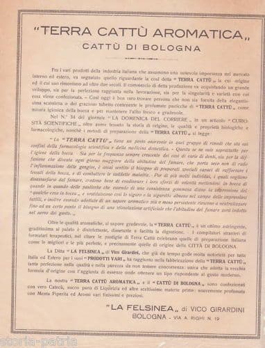 TERRA CATTU' AROMATICA CATTU' DI BOLOGNA *....* *LA FELSINEA* *di Vico Girardini* *Bologna* Interessante antico foglio volante, pubblicitario delle pastiglie a base di Catecù e succo puro di liquirizia ed altre "sceltissime materie prime...soavemente profumata con Menta Piperita ed aromi vari finissimi e preziosi"; prodotte dalla nota ditta bolognese, *utili per infiammazioni delle gengive, profumazione dell'alito, igiene della bocca, disinfettante e dissetante, facilita la digestione,...* foglio volante pubblicitario, di circa cm. 28x21,5 (l'intero foglio, compresi i margini bianchi irregolari e diseguali); impresso al recto verso bianco, su carta molto leggera tipo carta velina; s.d. ma databile primo '900 (circa anni '20 ?) DI INTERESSE SPECIALISTICO MEDICO FARMACEUTICO, STORICO-LOCALE, PUBBLICITARIO, COLLEZIONISTICO Buona conservazione generale, segni e difetti d'uso e d'epoca, piegature e sgualciture marginali con arosioni e strappetti al margine inferiore e destro; **meritevole di essere inserito sotto passpartout ed incorniciato.**