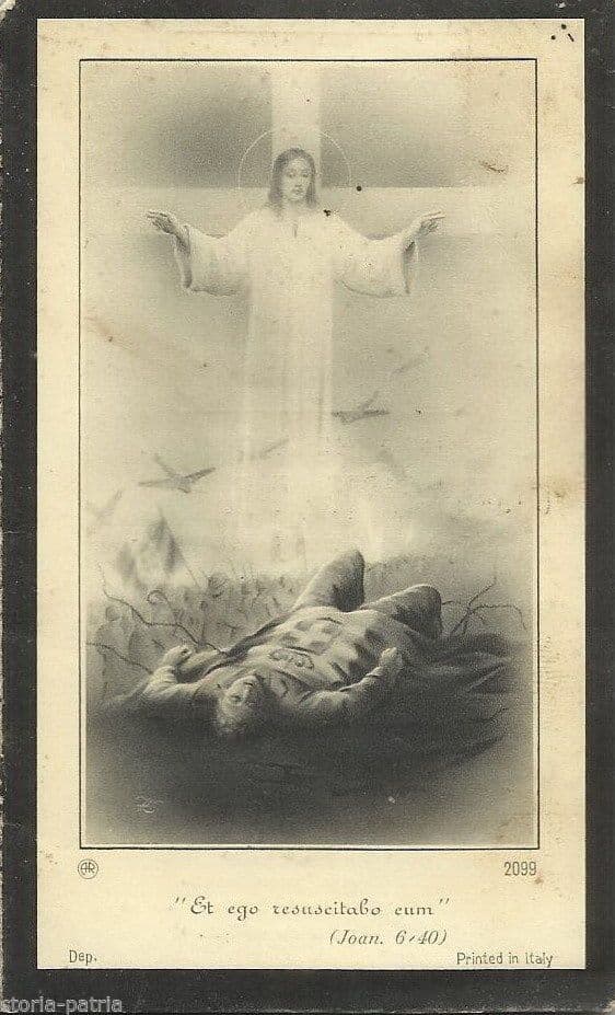 Urbano Pasquale *di Giuseppe* *nato a Bitonto il 20 novembre 1912* *Camicia Nera Scelta* *....* *Fronte greco, 23 marzo 1941* *....* Interessante antico "luttino", ossia pieghevole con foto originale applicata all'interno, edito in occasione della morte sul "fronte greco" del militare fascista bitontino; con all'interno la foto e scritte necrologiche e una Preghiera; all'esterno, vi è l'immagine devozionale raffigurante l'apparizione di Gesù su un campo di battaglia, con militari e un militare steso a terra morto e coperto dalla bandiera tricolore italiana con stemma sabaudo, e in cielo alcuni aerei in volo; misura circa cm.12x14 (foglio aperto o disteso); foglio listato a lutto con bordino nero; impresse tre delle quattro pagine del foglio piegato; databile al 1941, probabilmente impresso a cura di una tipografia pugliese dell'epoca. Di interesse fotografico, storico-locale, devozionale, militare, collezionistico Buona conservazione generale, segni e difetti d'uso e d'epoca, usuale piegatura centrale, sparse fioriture e sgualciture e abrasioni e difetti vari marginali e alla piegatura. *(l'immagine allegata raffigura alcuni particolare dell'intero oggetto, eventuali ulteriori informazioni a richiesta)* [](https://img854.imageshack.us/i/urbano9a.jpg/) [](https://img854.imageshack.us/i/urbano9aa.jpg/) [](https://img28.imageshack.us/i/urbano9cc.jpg/)