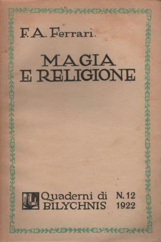 F. A. Ferrari Magia e religione Roma, Bilychnis, 1922 Cm.25, pp.55, bross. edit. *"Ha la magia preceduto dovunque nella storia l'orientamento religioso dell'anima umana?....oppure la forma primigenia della religiosità è da ricercarsi nel totemismo delle tribù veneratrici di animali, o nell'enoteismo morale di alcune privilegiate razze selvagge?"* Dotta e interessante dissertazione sui rapporti tra religione e magia, e sulla pretesa priorità della magia. Edizione di interesse culturale specialistico storico filosofico bibliografico Buona conservazione generale, segni e difetti d'uso e d'epoca.