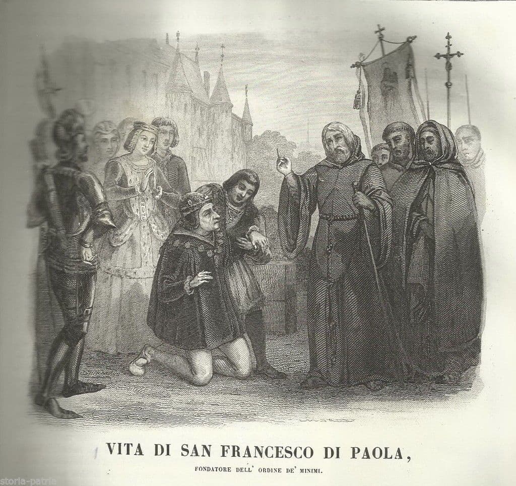 R. di Belleval Vita di San Francesco di Paola *Fondatore del'Ordine de' Minimi* S.i.t., (Tip. di Cosson), s. d. (Francia, fine '800 ?) Cm. 29x23; pp.8 nn.; senza legatura. Interessante edizione antica e d'epoca, bella monografia relativa alla storia e vita di San Francesco di Paola, venerato nella omonima cittadina calabrese (Paola, Calabria), *con citazioni o riferimenti alla sua città natia, a S. Francesco d'Assisi, Giacomo Martorillo o Martorello, convento di S. Marco, arcivescovo di Cosenza, papa Alessandro VI, Paterno, Spezzano, Sisto IV, Luigi XI, Napoli, Andrea D'Alesso, Carlo VIII, battaglia di Fornovo, Roma, monte Pincio, Giovanna di Valois, Spagna, Malaga, Castiglia, don Pietro di Lucena Olit, convento di Plessis-lez-Tours, ...* *edizione impreziosita da belle illustrazioni, con una grande incisione in prima pagina e le pagine successive arricchite da fregi artistici e illustrazioni marginali, illustranti vari momenti della agiografia del Santo, località o personaggi vari anche militari, e a fine testo una vignetta incisa che raffigura gli ultimi momenti di vita del Santo, disteso nel suo letto e confortato dalle preghiere di altri frati, con anche fregi o vessilli o insegne militari o araldiche.* Di interesse artistico, specialistico, religioso, storico-locale, bibliografico Discreta conservazione generale, segni e difetti d'uso e d'epoca, sparse fioriture e sgualciture o gore o difetti vari marginali, edizione senza legatura o copertine, parzialmente a fogli sciolti, meritevole di rilegatura; probabilmente in origine monografia estratta da una opera francese sulla vita dei Santi, forse opera edita inizialmente a fascicoli sciolti. *(le immagini allegate raffigurano particolari della intera pubblicazione, eventuali ulteriori informazioni a richiesta)* [](https://img89.imageshack.us/i/sfrancescop3aa.jpg/) [](https://img803.imageshack.us/i/sfrancescop3c.jpg/)
