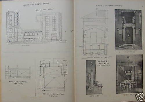 Carlo Angelo Ceresa Memorie di Architettura Pratica Piacenza, Tarantola, s.d. (primo '900 ?) Cm.34x24 circa; pp.104 sciolte; cartella editoriale. Interessante antica e rara edizione originale e d'epoca, con ampia raccolta di opere ingegneristiche e architettoniche inerenti palazzi ed edifizi vari di Torino e di altre località piemontesi, progetti del Ceresa e di altri ingegneri o architetti. Tra i numerosi progetti, raffiguranti varie prospettive e piante e sezioni, segnaliamo: *Bagni Popolari e Lavatoio di Borgo S. Salvatore in Torino (arch. Dolza)* *Villino Detto il Saraceno del Comm. Rostain in Borgio (arch. Ceresa)* *Palazzina Capitano Cerutti in Borgio (arch. Ceresa)* *Scuola Elem. Alfieri in Torino (arch. Dolza)* *Palazzina Demichelis d'Aragona in Torino (arch. Momo)* *Casa Luigi Minetti in Torino (arch. Ceresa)* *Riordinamento Palazzo della Società Bancaria Italiana in Torino (arch. Vicarj)* *Villino Ceresa in Bardonecchia (arch. Ceresa)* *Villa Schutz in Torrepellice (arch. Momo)* *Cappella Privata nel Castello del Conte Cesare Balbo di Vinadio in Torre di Bairo Canavese* *(arch. Ceresa)* *Nuovo Edificio per la Scuola di Guerra in Torino (arch. Ceresa)* *Palazzina Rostain in Torino (arch. Vicarj)* *Casa da Pigione Signorile Ing. Morelli in Torino (arch. Momo)* *Progetto per una Sezione Staccata delle Sede Centrale dell'Accademia di Brera (arch. Ricotti)* *Villa Peyrot in Rivoli (arch. Mollino)* *Tomba Nobile Famiglia Rasini di Mortigliengo a Moncalieri (arch. Momo)* *Casa Salesiana per la Polonia in Oswiecim (arch. Ceradini)* *Casa Emilio Pugliese in Torino (arch. Ceresa)* *Di ogni progetto sono raffigurate varie figure e prospettive, impresse su tavole sciolte -sia al recto che al verso- in ordine spesso non progressivo, anche immagini a piena pagina, anche fotografiche della realizzazione finale.* **** Opera rara *(due soli esemplari noti nel sistema bibliotecario nazionale italiano)* Di interesse specialistico ingegneristico architettonico, storico-locale e bibliografico *Tavole meritevoli anche di essere incorniciate distintamente, per arredare ambienti vari o studi professionali* Buona conservazione generale, segni e difetti d'uso o d'epoca, sparse fioriture, annotazioni, exlibris, tavole sciolte racchiuse in cartellina, non presente un testo esplicativo; sulla copertina della cartellina sono indicati "215 progetti di architettura", quantitativo probabilmente riferito al numero totale delle prospettive ivi presenti, classificazione senza un ordine specifico con molti progetti che occupano anche più pagine e in ogni pagina più prospettive, e la progressione delle pagine-tavole arriva fino a pagina 104, presumibilmente l'opera completa (non esiste un indice!) ma numerazione corrispondente agli esemplari noti in biblioteche pubbliche; pertanto esemplare da considerarsi completo, ma proprio perchè a fogli sciolti e senza un indice lo si offre così com'è senza alcuna garanzia di integrità; ma trattandosi di una pubblicazione a fogli sciolti ben si presta eventualmente ad incorniciare i singoli fogli a scopo arredativo, per esempio per uno studio di architettura o ingegneria); bella copertina rigida (cartellina) con scritte dorate e illustrazione del villino a Torrepellice. *(le immagini allegate raffigurano alcuni particolare dell'intera pubblicazione, a richiesta eventuali altre informazioni)*