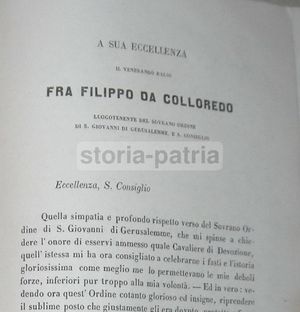 Interessante edizione d'epoca pubblicata dal dotto letterato e storico pugliese Salvatore Fenicia. L'opera, dedicata al Balì Fra Filippo da Colloredo, analizza la storia e l'araldica dei principali ordini cavallereschi, tra cui i Cavalieri Ospitalieri, i Teutonici, i Templari e l'Ordine di Malta.