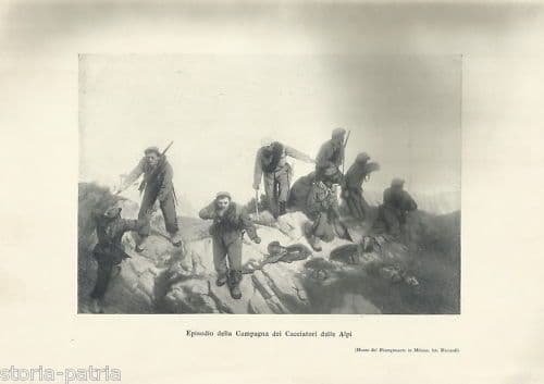 Episodio della campagna dei Cacciatori delle Alpi Interessante antica stampa, raffigurante una scena di epoca risorgimentale legata agli eventi dell'epopea garibaldina, *così come da dipinto del Museo del Risorgimento di Milano, foto Riccardi;* misura circa cm. 29x20 (l'intero foglio, a margini bianchi diseguali); esemplare edito probabilmente come tavola illustrativa di un'opera di interesse storico celebrativo del primo '900 (1907 ?). Di interesse artistico risorgimentale storico-locale emiliano collezionistico Buona conservazione generale, usuali segni o difetti d'uso e d'epoca, ***meritevole di essere inserita sotto passpartout ed incorniciata***. *(l'immagine allegata raffigura un particolare dell'intero foglio, eventuali altre informazioni a richiesta)*