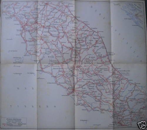 **Italia Centrale** Interessante antica e inusuale mappa geografica dell'Italia Centrale, con estensione da nord a sud, dalla Romagna alla Campania, e con numerosi topinimi relativi a piccole o grandi località così come sono disposte sulla rete viaria, autostrade e altre strade principali, ma anche visibile la rete dei collegamenti ferroviari. *Raffigurati tra altri Bologna, La Spezia, Massa, Firenze, Cervia, Faenza, S. Marino, Perugia, Orvieto, Ancona, Tolentino, Volterra, Livorno, Pisa, Prato, Arezzo, Pontremoli, Foligno, l'Isola d'Elba, Viterbo, Narni, Terni, Roma, Bracciano, Teramo, S. Benedetto del Tronto, Pescara, Ortona, Vasto, Termoli, Lucera, Campobasso e un pò tutto il Molise, Napoli e l'Irpinia con Benevento e Avellino, la campagna romana con Littoria, Terracina, Sora, Frosinone, Tivoli, ...* Mappa apparsa in origine come tavola illustrativa probabilmente di una guida turista della metà del '900; misura cm.30x33 circa (l'intero foglio, compresi i margini bianchi irregolari e rifilati diseguali) Di interesse culturale storico-locale geografico e collezionistico Buona conservazione generale, segni e difetti d'uso o d'epoca, varie piegature, **meritevole anche di essere inserita sotto passpartout ed incorniciata.**